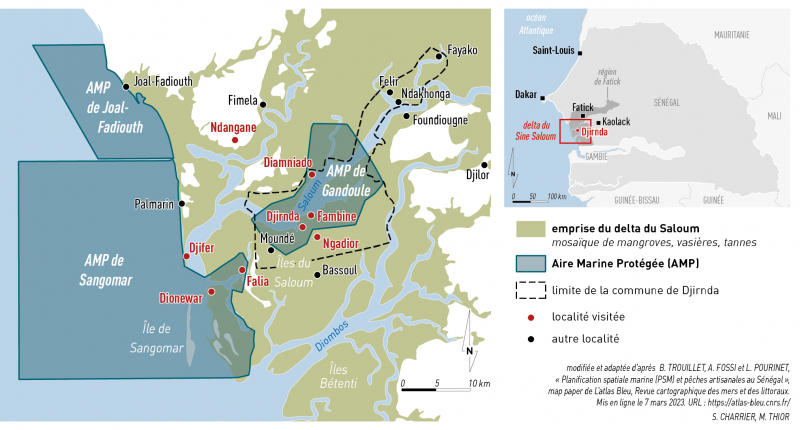 Le village de Djirnda dépend de l'AMP de Gandoule, créée en 2014, correspondant aux AMP récentes de la troisième génération reposant sur une forte intégration participative des populations. Ces dernières ont demandé la création de l'Aire Marine Protégée suite au constat de la baisse de la ressource et de la diminution des espèces. En 2021, au moment du renouvellement du comité de gestion, la superficie de l'AMP est passée de 15 500 ha à 28 121 ha ; d'autres communes ont adhéré expliquant l'extension de l'AMP en 2021. Les pêcheurs et les habitants se sont appropriés cette AMP. Le comité de gestion se réunit pour délimiter les zones de repos biologique, sur une base d'observations et de connaissances vernaculaires sans pour autant s'appuyer sur une base animiste comme c'est parfois le cas chez les Diola de Casamance (Thior et Desse, 2023). Ainsi, les bolongs de moins de 10 mètres de large constituent la partie protégée et sont interdits aux pêcheurs.