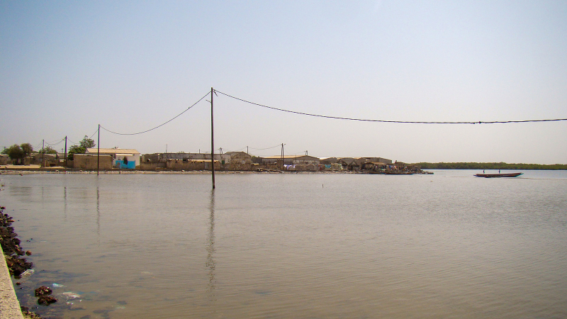 Du ponton, le village de Djirnda qui accueille 3 600 habitants semble bien austère, une certaine pauvreté se dégage. Pauvreté d'un milieu sous tension qui s'élève à peine de l'eau de l'estuaire, marquée par l'absence d'arbres, de manguiers, de jardins, de cases. De même, si les amas de coquillages et le séchage du poisson attestent d'une forte activité de pêche, la prédation des milieux et l'érosion de la biodiversité sont palpables.