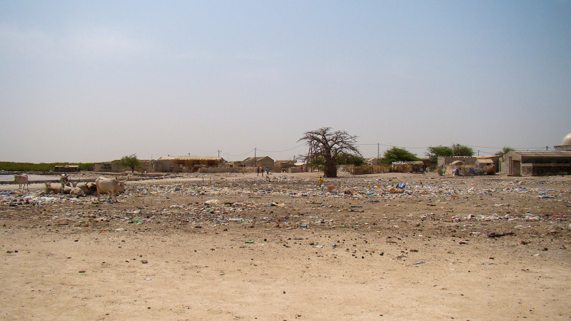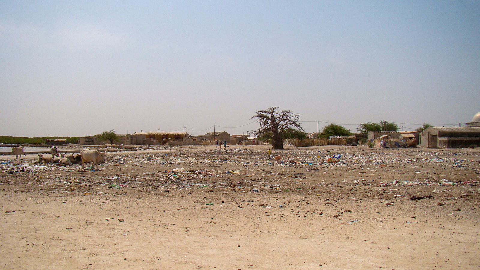 Les maisons sont en parpaing, couvertes de tôles, organisées le long de rues parfois rectilignes, une organisation qui renforce aussi sans doute cette impression d'une indigence prégnante. Pauvreté par l'absence de voitures, de motos, il n'y a pas de commerces, à part plusieurs épiceries de quelques mètres carrés et une boulangerie. La sursalinité des sols affecte la qualité des eaux de pompage ou des puits, mais ronge également toutes les constructions (photo 2), maisons en parpaing comme les puits maçonnés et nécessite une constante autoconstruction. La digue-barrages construite à l'est du village atteste de la menace grandissante de submersion marine (photo 3) qui pèse sur les villages de l'estuaire du delta du Saloum en raison du changement climatique.
