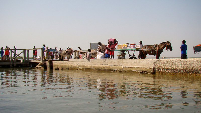 Pour autant, après 1h30 à 2 heures de pirogues en arrivant des ports de Ndangane, de Djifer ou de Foundiougne (Ndakhonga) sur la partie nord-ouest du Saloum, le ponton de Djirnda constitue la principale entrée de l'île et du village. Les grandes pirogues de transport y convergent, débarquant ses passagers ou des marchandises essentielles : parpaings, bouteilles de gaz, denrées alimentaires, parfois un âne. Sur le quai, les jeunes garçons d'une dizaine d'années jouent les équilibristes pour vider les pirogues, charger les cabriolets tirés par des mules et conduits par d'autres adolescents plus âgés. Et déjà il faut charger les pirogues qui repartiront bien vite. En débarquant, l'insularité porte ses marques, d'une temporalité différente, d'une rupture qui parfois confère à l'isolement quand l'harmattan souffle sur le Saloum rendant la navigation piroguière difficile.
