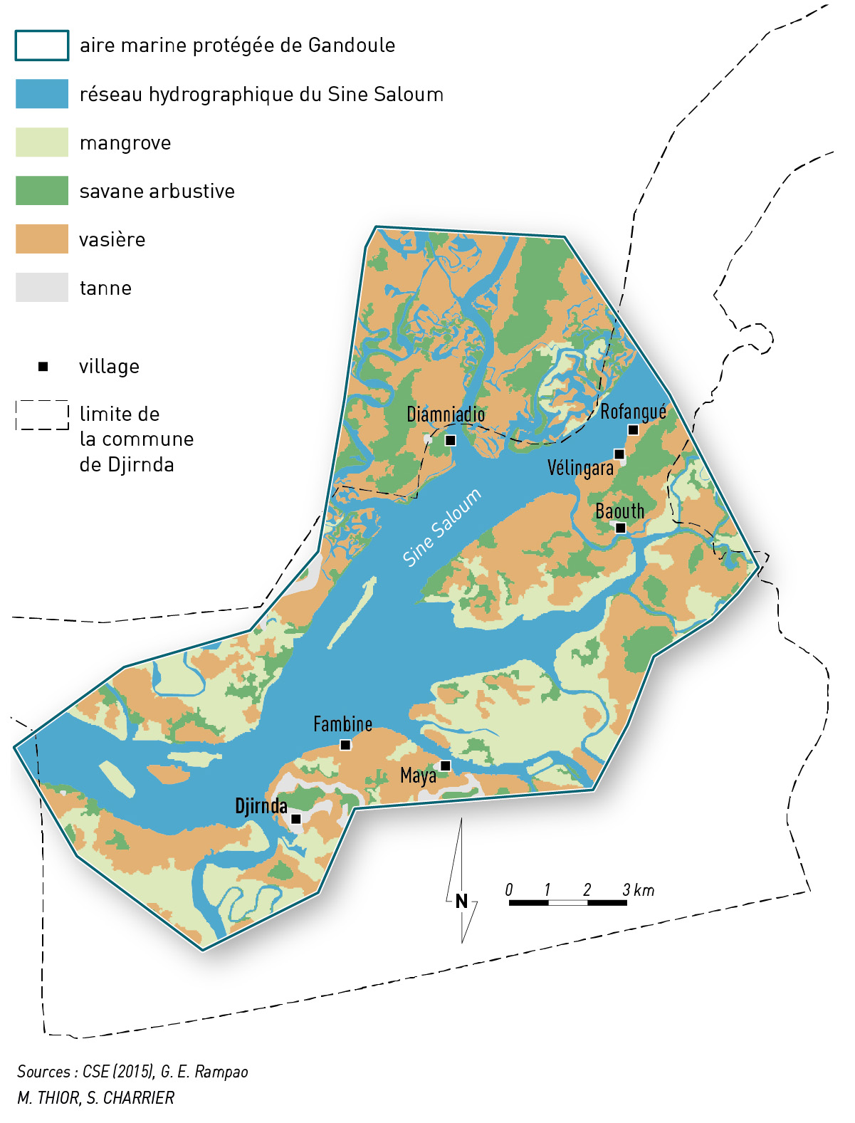 Le traitement des données a été permis par l'utilisation de logiciels tels que ArcGis 10.5 pour la mise en page cartographique, QDA Miner Lite pour la transcription des entretiens. Des coordonnées géographiques à travers un GPS de type smart ont été prises pour une meilleure reconnaissance des limites des Aires Marines Protégées visitées (fig. 1). Les localités de Ndagane, Djifère, Dionwar Falia, Djirnda, Nghadior, et Diamniadio ont été visités dans le Gandoule. Cependant, l'île de Djirnda a fait l'objet d'une étude de cas plus poussée.