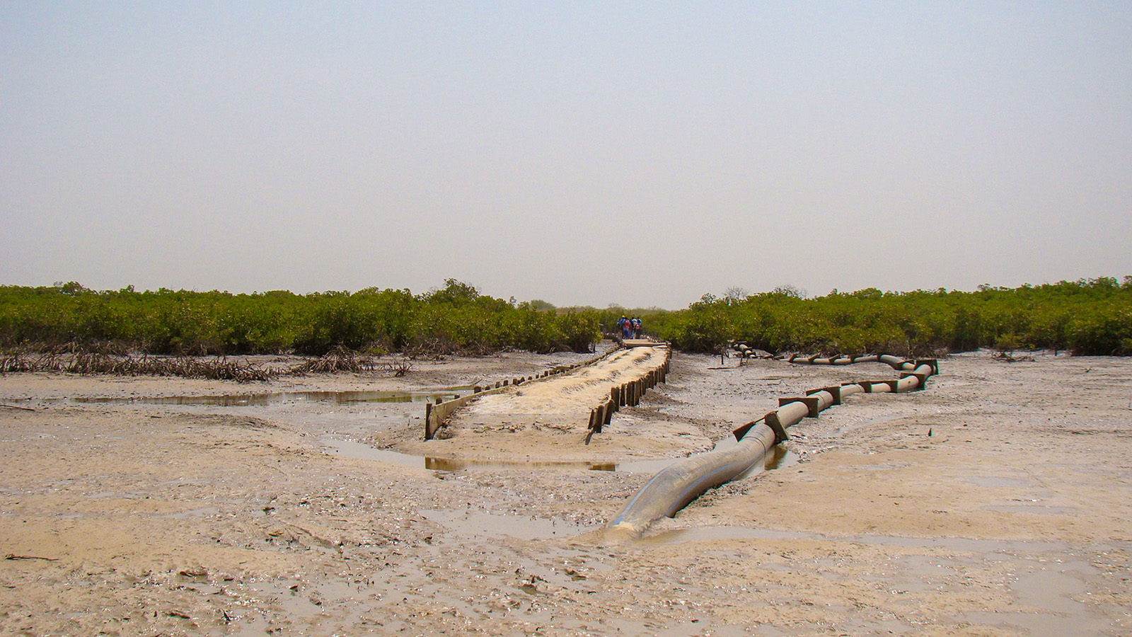 Photo 6 - Pipeline d’eau et cheminement possible à marée basse à travers la mangrove