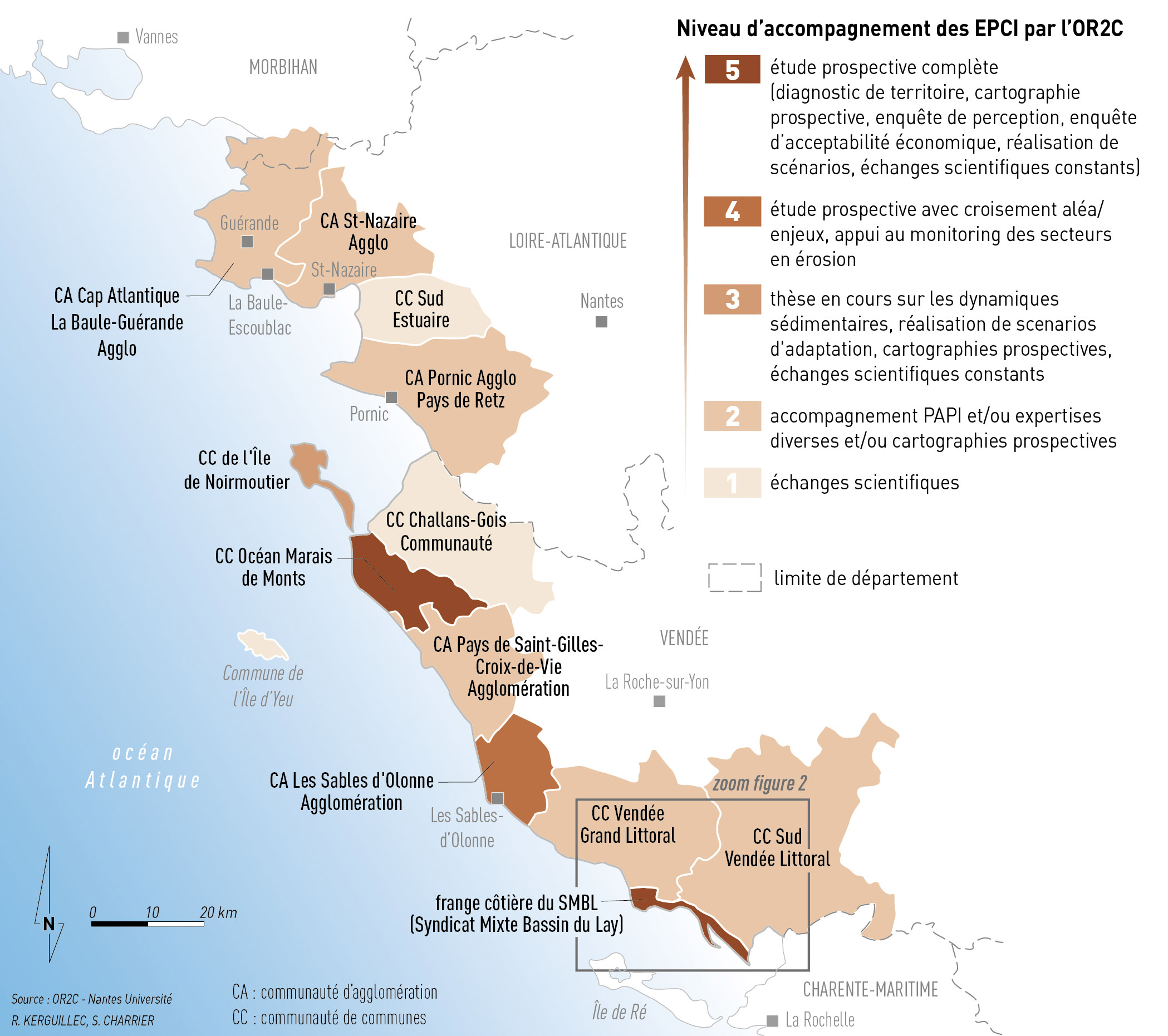 C'est en tant que plateforme régionale spécialement dédiée aux risques côtiers en région Pays de la Loire que l'OR2C a servi de cadre à cette démarche. Fort d'un partenariat réunissant 36 structures impliquées dans l'étude et la lutte contre les risques côtiers, l'OR2C est un observatoire d'envergure régionale mis en place depuis 10 ans (2016). Il tire son originalité d'une gouvernance ouverte de l'échelon national à l'échelon local, dans laquelle toutes les collectivités littorales des Pays de la Loire sont représentées. Il se singularise également par son lien étroit avec la recherche académique du fait de son animation par Nantes Université via l'UMR CNRS 6554 LETG, cette gouvernance se prêtant au déversement de résultats de recherche dans la sphère opérationnelle et prodiguant une caution scientifique aux démarches engagées (Kerguillec et al., 2019). L'OR2C a construit son expérience à travers ses missions de renforcement de la connaissance du risque d'érosion et de submersion marine et d'animation autour des risques côtiers, mais aussi grâce à l'acquisition et la diffusion de données LiDAR haute résolution par l'OSUNA, au développement d'outils numériques à destination des structures gemapiennes et à l'accompagnement des territoires côtiers. Depuis 5 ans, cette mission d'accompagnement occupe d'ailleurs une place croissante dans les travaux de l'observatoire, celui-ci étant désormais impliqué à des degrés divers dans la plupart des territoires littoraux en région Pays de la Loire. La figure 1 illustre cette implication au moyen d'un indice caractérisant le niveau d'accompagnement des territoires par l'OR2C, construit en fonction du degré d'implication de l'observatoire auprès des territoires et allant d'échanges scientifiques occasionnels à un accompagnement étroit dans les démarches d'adaptation.