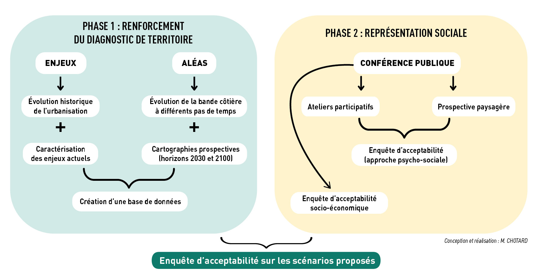 L'étude SMBL a bénéficié d'une phase de réflexion préalable dont l'objectif était de questionner le principe même d'adaptation et les outils disponibles pour mener à bien cette démarche en contexte littoral, aboutissant notamment à l'analyse du processus de recomposition spatiale en particulier sous ses aspects juridiques, spatiaux et psychologiques. Cette première phase a permis d'identifier les leviers et points de blocage dans la mise en œuvre d'un processus de recomposition des territoires, de prendre en compte les retours d'expérience et de faire évoluer les cadres théoriques et pratiques de l'adaptation au changement climatique. Par conséquent, la mobilisation de l'équipe universitaire a contribué à incorporer des démarches propres à la recherche à chaque étape, apportant une caution scientifique souhaitée par le commanditaire pour appuyer solidement sa propre réflexion.