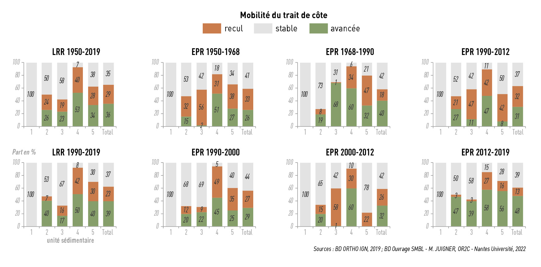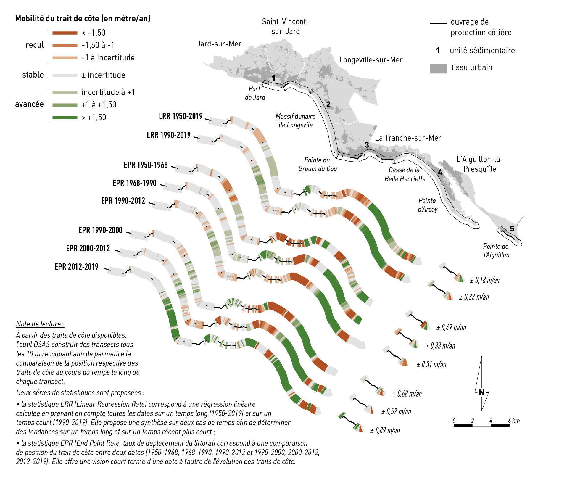 Figure 4b - Mobilité historique du trait de côte (1950-2019) à l'échelle du littoral du SMBL