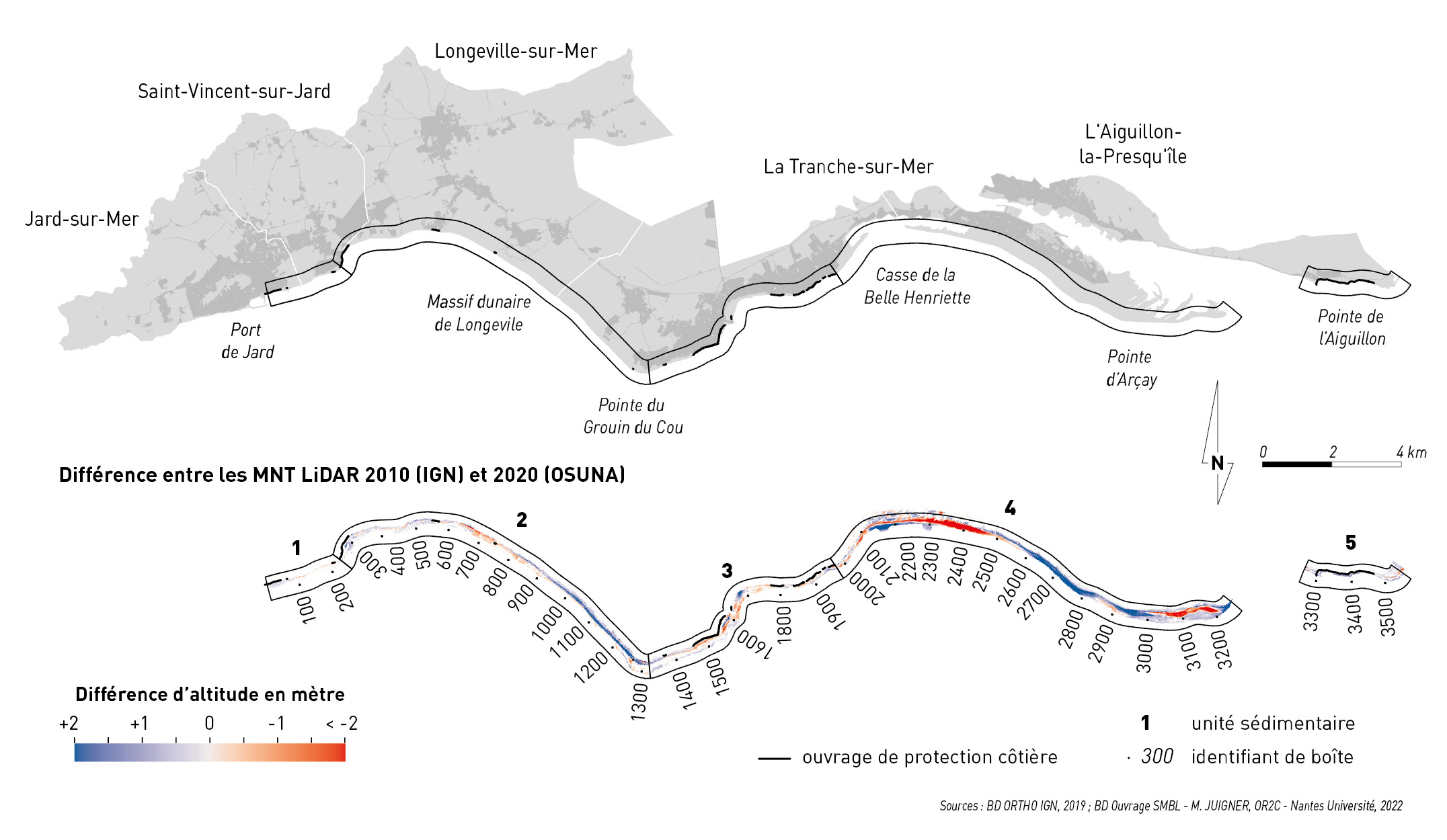 Kerguillec R., Audère M., Baltzer A., Debaine F., Fattal P., Juigner M., Launeau P., Le Mauff B., Luquet F., Maanan M., Pouzet P., Robin M., Rollo N., 2019. Monitoring and management of coastal hazards: creation of a regional observatory of coastal erosion and storm surges in the Pays de la Loire region (Atlantic coast, France), Ocean & Coastal Management, 181. [DOI : https://doi.org/10.1016/j.ocecoaman.2019.104904]