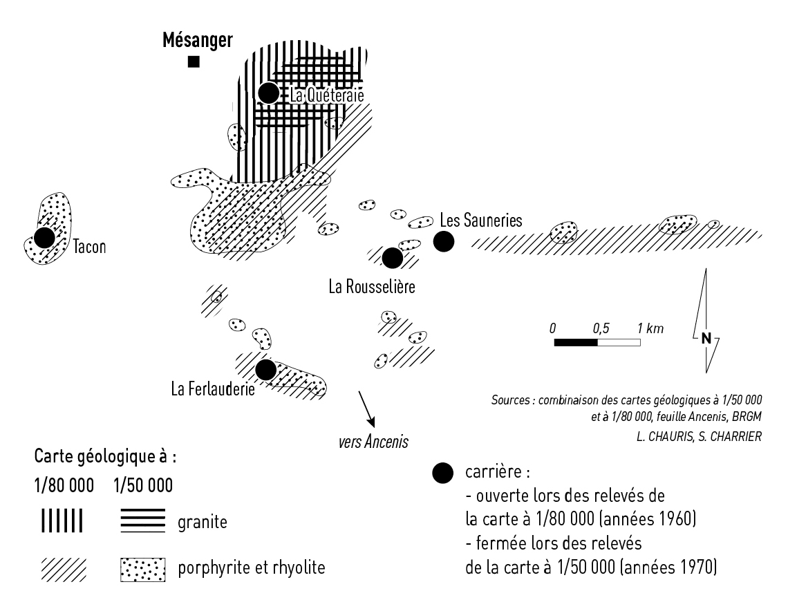 Reprenant l’œuvre remarquable de mes prédécesseurs (Bureau L. et E., 1890 ; Baret Ch., 1898 ; Cavet P. et al., 1967, 1978 ; Allon A., 1980) en la synthétisant et en la complétant par de nouvelles observations, nous présentons le résultat de nos recherches sur les intrusions d’âge carbonifère des environs de Mésanger dans le bassin d’Ancenis, en examinant les petits pointements magmatiques, puis les minéralisations qui leur sont associées, observations facilitées par l’ouverture de plusieurs carrières.