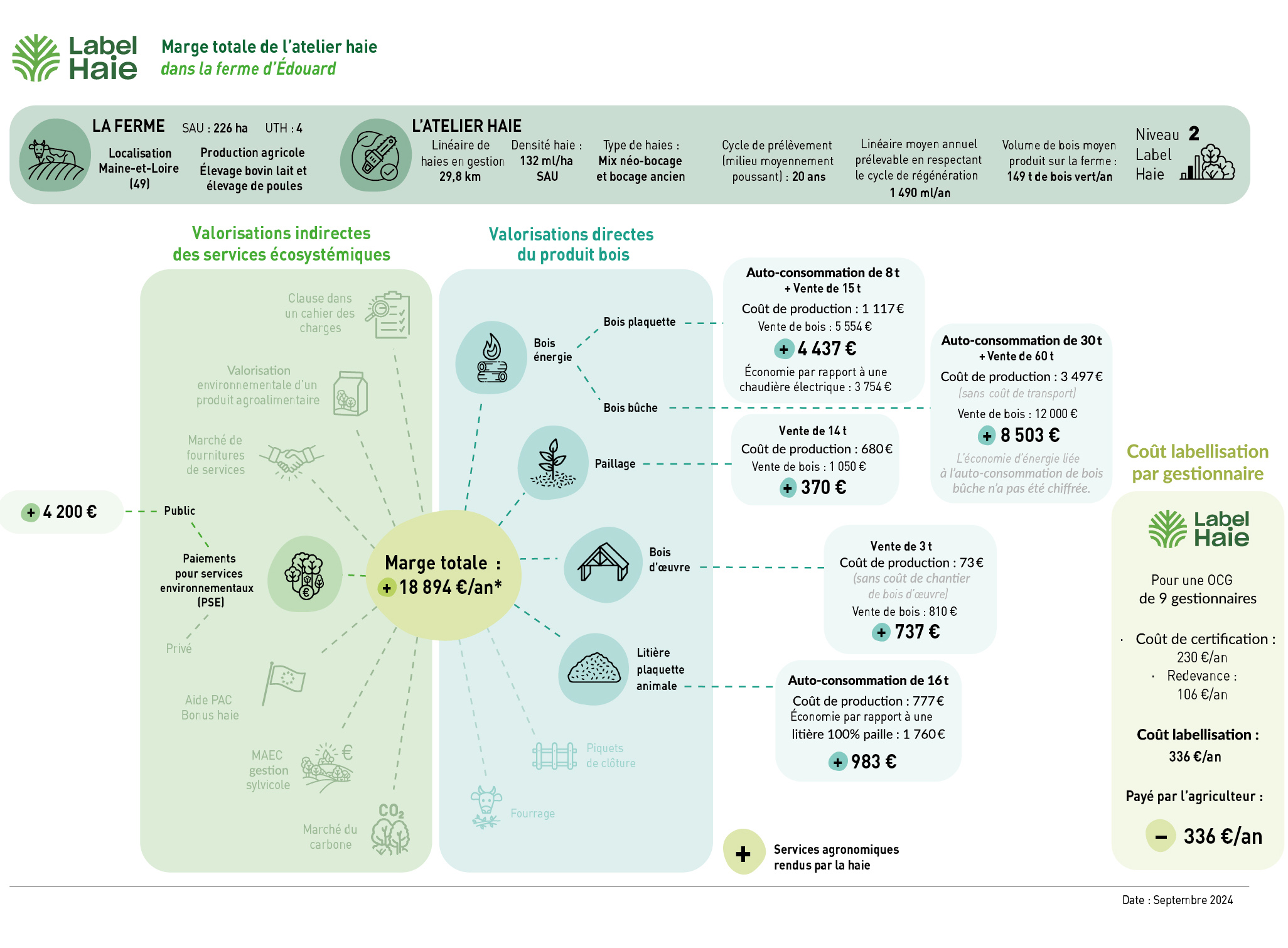De réelles opportunités s’ouvrent ainsi aux agriculteurs. À titre d’exemple, une exploitation de 110 ha en polyculture-élevage laitier avec 14 km de haies, perçoit de l’ordre de 12 500 € sur 5 ans (2 500 €/an) au titre du Label bas-carbone au tarif de 32 €/t net exploitant, et 40 €/t brut.