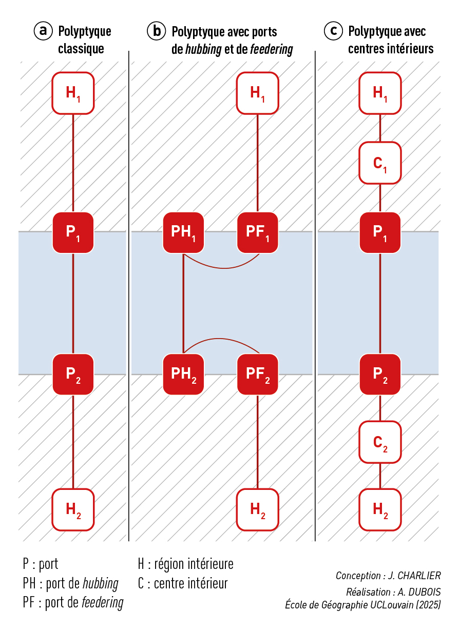 La configuration des chaînes de transport de porte à porte s'est trouvée modifiée par l'essor de ces ports de hubbing et, corrélativement, par la multiplication des ports moyens et secondaires réduits à un statut de ports de feedering après avoir perdu tout ou partie de leurs relations océaniques directes. Les premiers ont été désignés PH et les seconds PF dans la partie centrale de la figure 5, où est représentée une chaîne de porte à porte impliquant, dans un polyptyque plus complexe, le passage par ces deux types de port de part et d'autre de l'espace marin central (avec ici aussi des indices 1 et 2 pour distinguer les deux rives) afin de relier des régions intérieures (désignées H1 et H2).