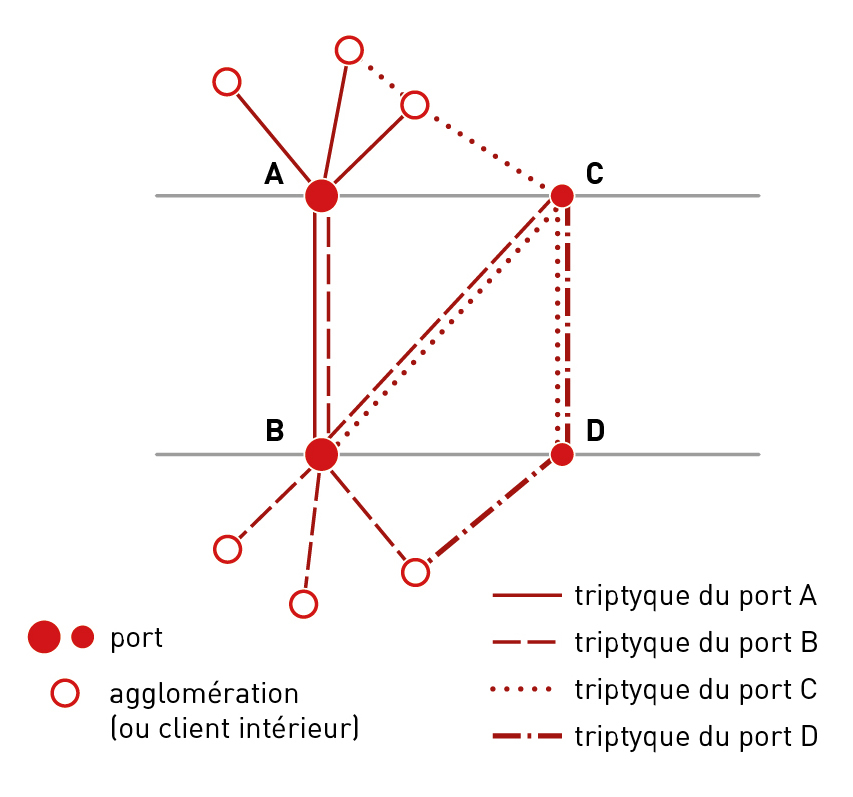La notion de triptyque n'émerge donc qu'avec la Révolution industrielle, la massification des échanges et la complexité des chaînes de production de produits de plus en plus élaborés. On comprend alors que les premières typologies portuaires, comme celle de P. de Rousiers (1904), tout en tenant compte des innovations du moment (les ports industriels), rappellent encore les modes d'échanges de l'Ancien monde (les ports de négoce), le rôle des arrière-pays étant encore limité aux seuls ports régionaux. Le mérite d'A. Vigarié, en préparant sa thèse sur une façade fortement dynamisée par l'industrie et au débouché de nombreux axes de pénétration terrestre (la façade maritime de la Seine au Rhin), est d'avoir replacé les ports au cœur des enjeux de la circulation moderne, puisqu'ils devenaient de véritables synapses entre des axes de circulation et même des « super-synapses », dans la mesure où ils étaient à l'intersection entre deux grands types de réseaux (mer, terre) d'organisation, d'échelle et de coût totalement différents.