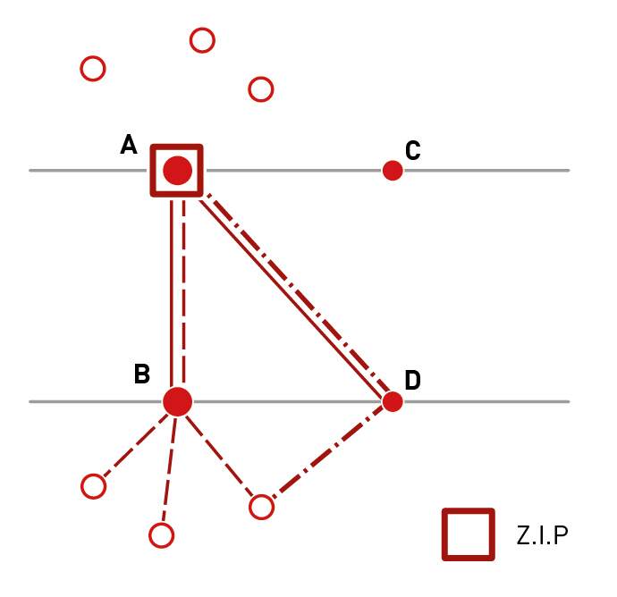 Note de lecture : Dans ce dernier cas, le port A bénéficie d’usines bord à quai (grâce à une zone industrialo-portuaire, Z.I.P ou M.I.D.A. en anglais), à l’inverse du port B qui continue à vivre selon le schéma de circulation précédent. Le poids du port A augmente, du moins par le tonnage, car ses relations d’arrière-pays sont profondément révisées, beaucoup de clients industriels disparaissant dans son arrière-pays en raison de l’efficacité des usines bord à quai. Par contrecoup, le port C est marginalisé. Cette évolution va à contrecourant des théories des pôles de croissance, mais est malheureusement souvent vérifiée dans les faits.