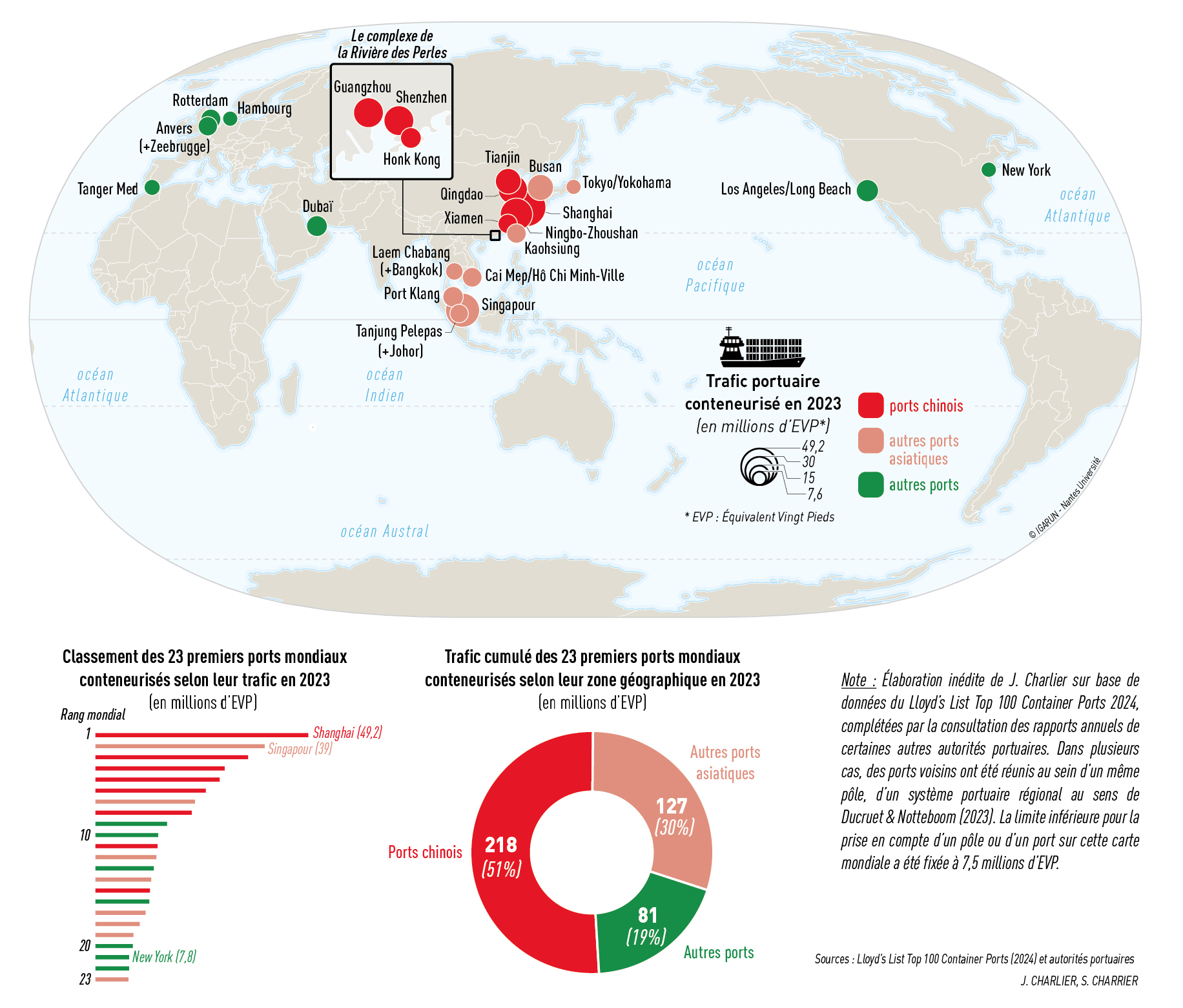 Note : Élaboration inédite de J. Charlier sur base de données du Lloyd’s List Top 100 Container Ports 2024, complétées par la consultation des rapports annuels de certaines autres autorités portuaires. Dans plusieurs cas, des ports voisins ont été réunis au sein d’un même pôle, d’un système portuaire régional au sens de Ducruet & Notteboom (2023). La limite inférieure pour la prise en compte d’un pôle ou d’un port sur cette carte mondiale a été fixée à 7,5 millions d’EVP.