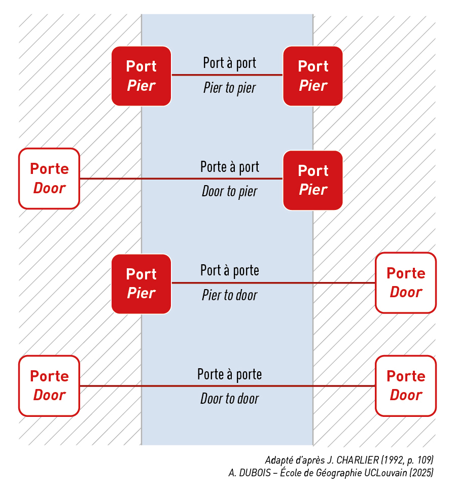 La transition des marchandises générales conventionnelles vers le conteneur s'est opérée par étapes successives (Vigarié, 1999), entre pays développés tout d'abord, puis en s'élargissant à ceux qui étaient en transition et en voie de développement, avec partout d'importantes conséquences portuaires et urbaines. Du transport purement maritime de port à port encadré par deux segments terrestres bien distincts pris en charge par des opérateurs non maritimes séparés, on est passé (partiellement) à un transport multimodal intégré de porte à porte pris en charge dans sa totalité par les armements maritimes. Devenus opérateurs globaux, ces derniers intègrent en effet de plus en plus dans leurs cotations les pré- et post-acheminements des boîtes, selon la pratique dite du carrier haulage. Du pier to pier on est ainsi passé au door to door (fig. 3). Toutefois, il faut signaler qu'à côté de ces deux configurations extrêmes, existent aussi les formules hybrides du pier to door (port à porte) et du door to pier (porte à port). Ces formules ne valent pas qu'en trafic océanique, car elles se sont étendues aux trafics de fret à courte distance, en particulier dans le roulage des remorques non accompagnées ou des conteneurs sur remorques.
