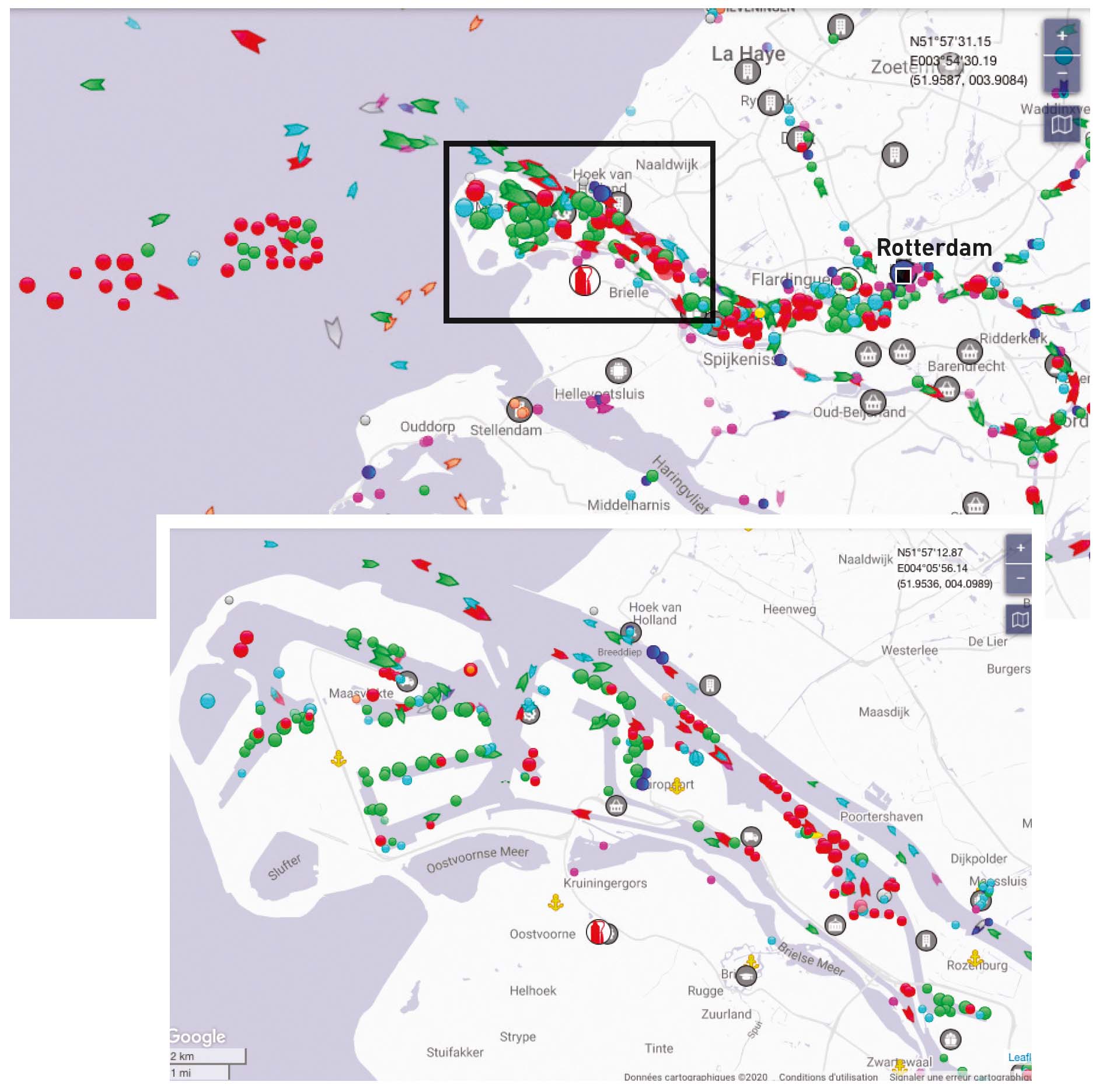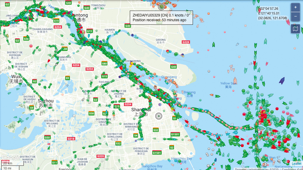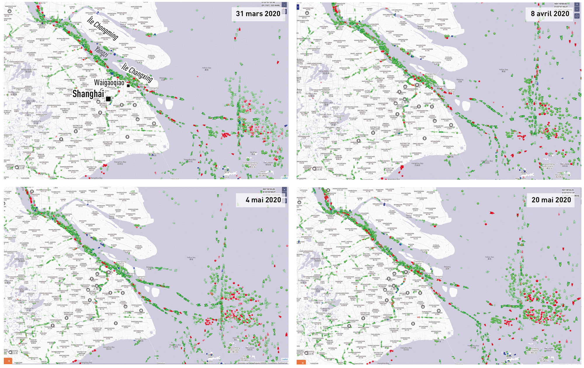 Cette série d’instantanés du trafic portuaire au large du port de Shanghai, premier port mondial et de ses avant-ports de Waigaoqiao et de Yangshan, des îles Chongming et Changxing dans l’estuaire du Yangzi montre de fin mars à mai 2020, une situation inédite. Les usines chinoises ont repris leur production, mais l’Europe et les États-Unis sont confinés avec les commerces fermés et de nombreuses usines fermées ou en reprise partielle en mai. Dans ces conditions, le nombre de navires en attente au large augmente : 132 cargos (porte-conteneurs, feeders, vraquiers) le 31 mars, 135 le 8 avril, 155 le 4 mai et 188 le 20 mai. Les supertankers sont aussi au mouillage, 40 le 31 mars, 67 le 20 mai. La logistique maritime, n’ayant pas prévue les 15 jours à trois semaines d’arrêt de l’économie chinoise, les navires attendent le retour à la normale qui se fait attendre du fait de la forte diminution de la demande européenne et américaine. Enfin, les mesures de quarantaine qui touchent les équipages, s’ils ont fait escale depuis moins de quatorze jours, impactent aussi les attentes au mouillage.