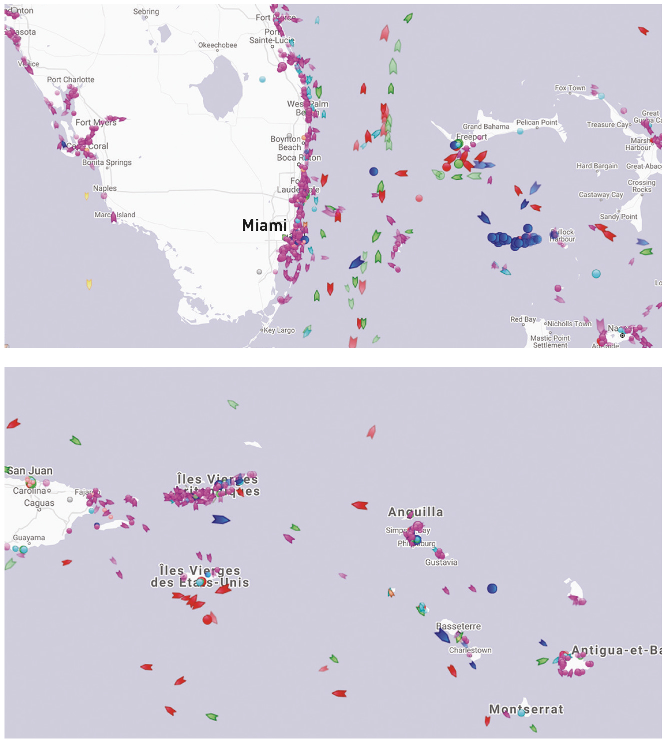 L’économie de la croisière est à l’arrêt. Miami, premier port de croisière au monde, n’a plus d’activité, les navires sont à quai à Dodge Island ou au mouillage à l’abri des Bahamas. Le littoral de Floride prend la teinte rose attribuée à la grande plaisance et aux yachts qui ne naviguent plus puisque les escales leurs sont interdites, à moins de respecter la quatorzaine et de ne pas descendre à terre. Le même scénario se retrouve dans toutes les îles de la Caraïbe, yachts à quai à Antigua comme dans l’archipel des îles Vierges britanniques ou américaines. Dans les ports têtes de ligne comme San Juan de Porto Rico, les paquebots sont à quai et les économies touristiques insulaires souffrent.