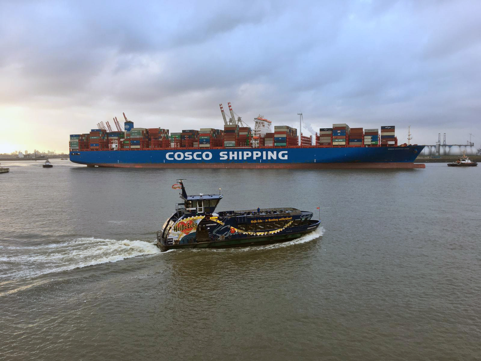 Photo 1 - Porte-conteneurs de la compagnie chinoise Cosco arrivant presque à vide dans l’estuaire de l’Elbe à Hambourg