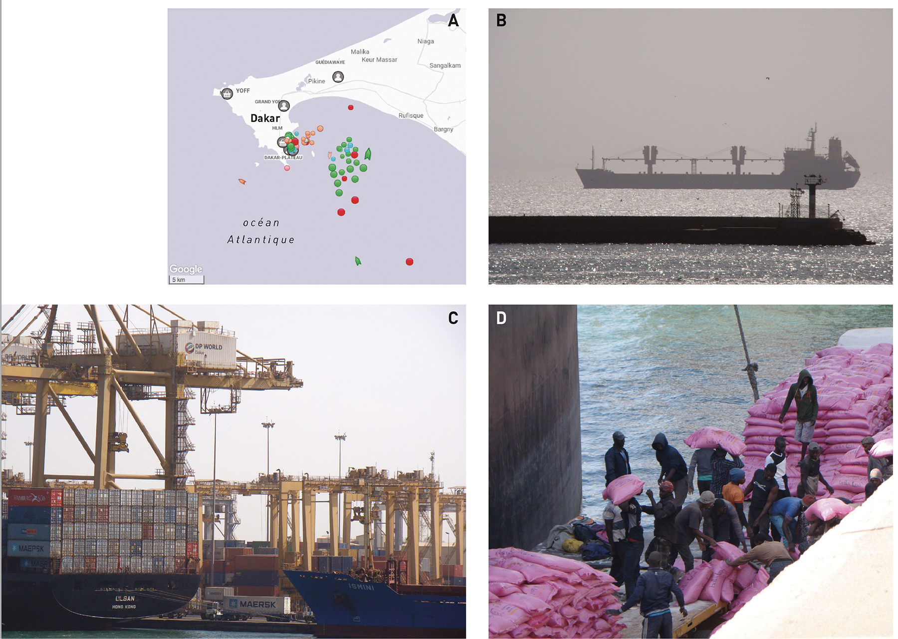 L’engorgement des navires en quarantaine, près de 20 cargos, vraquiers et porte-conteneurs au large de Dakar (A et B). Même si le port dispose d’un terminal à conteneurs efficace, géré par l’opérateur de Dubaï, DP World (C), les mesures sanitaires ont retardé le travail des dockers (D).