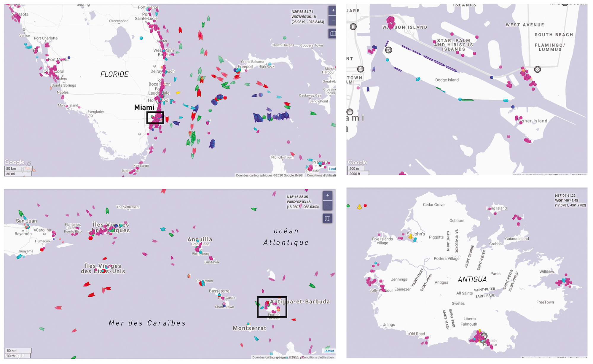Figure 6 - En haut, le littoral de la Floride (à gauche) et un zoom sur le port de Miami (à droite) le 10 mai 2020. En bas, la mer des Caraïbes (au nord des Petites Antilles : les îles Vierges et Antigua, à gauche) et un zoom sur l'île d'Antigua (à droite) le 15 avril 2020