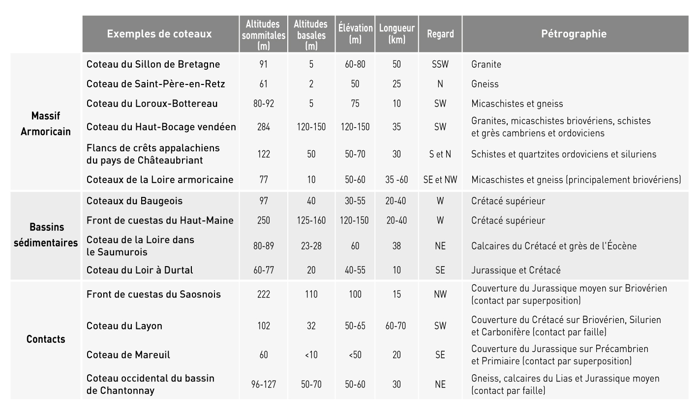 Une première distinction a d’abord été établie en fonction de la place des coteaux dans les grands domaines morpho-structuraux : massif ancien et bassins sédimentaires, en prenant le parti de ne pas réduire le sujet aux derniers. En domaine de socle, les coteaux singuliers correspondent surtout à des escarpements de faille hérités et/ou atténués, ou à des escarpements de lignes de faille, formés en bordure de blocs soulevés ou basculés. Certains proviennent, au moins partiellement, de l’érosion différentielle le long d’un contact lithologique ou en bordure de crêts appalachiens, parfois d’emboîtements cycliques (raccordement entre deux niveaux d’érosion étagés). Les coteaux doubles bordent la vallée de la Loire, qui relie, par endroits, des fossés d’effondrement. En domaine sédimentaire, les coteaux singuliers correspondent surtout à des rebords de plateaux monoclinaux ou à des fronts de cuestas, parfois aux flancs de buttes-témoins ou d’avant-buttes étendues. Certains, moins fréquents, proviennent de failles. Les coteaux doubles bordent là aussi la Loire et ses affluents. Au contact du Massif armoricain et des bassins adjacents se trouvent des coteaux qui tiennent à l’érosion différentielle (cuestas ou fausses-cuestas) ou à la tectonique (escarpements de faille), souvent à des processus complexes (escarpements composites).