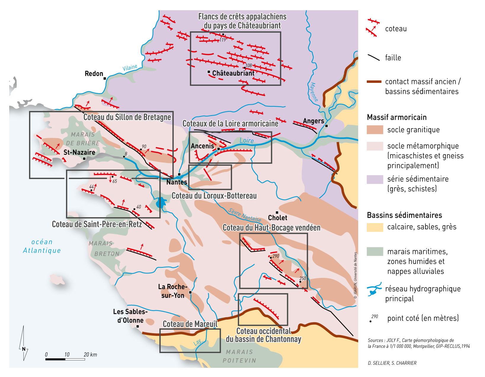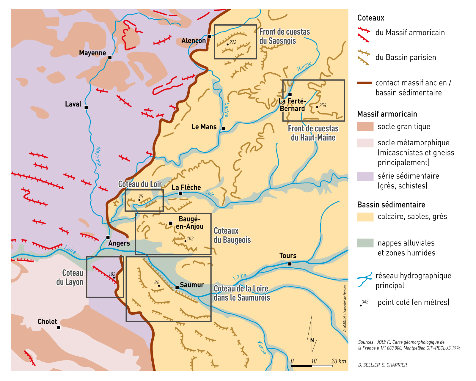 Le Massif armoricain s’étend sur la totalité de la Loire-Atlantique et de la Mayenne (Bas-Maine, drainé par la Mayenne), sur l’essentiel de la Vendée, sur la moitié occidentale du Maine-et-Loire (Anjou noir) et sur la bordure occidentale de la Sarthe. Il est formé de roches cristallines, dures, donc cassantes et fracturées, mais aussi imperméables, donc propices à la concentration des eaux et à une forte densité du drainage. Il est ainsi doté de nombreux escarpements de faille et versants de vallées. Le Bassin de Paris concerne la quasi-totalité du département de la Sarthe (Haut-Maine, drainé par la Sarthe) et la partie orientale du Maine-et-Loire (Anjou blanc), alors que le Bassin aquitain ne concerne que le sud de la Vendée (plaine de Luçon et marais Poitevin). Ils sont naturellement constitués de roches sédimentaires, normalement peu déformées (structures aclinale ou monoclinale), impliquant respectivement des coteaux s.s. et des fronts de cuestas, parfois faillées (déterminant ici aussi des escarpements de faille, éventuellement assimilables à des coteaux), de résistance inégale, donc propices à l’érosion différentielle. Les Pays de la Loire se singularisent essentiellement par cette dualité. Ils correspondent à un pays de contact massif ancien-bassins sédimentaires, ce qui implique également des formes de versants, donc des types de coteaux, spécifiques d’un tel contact.