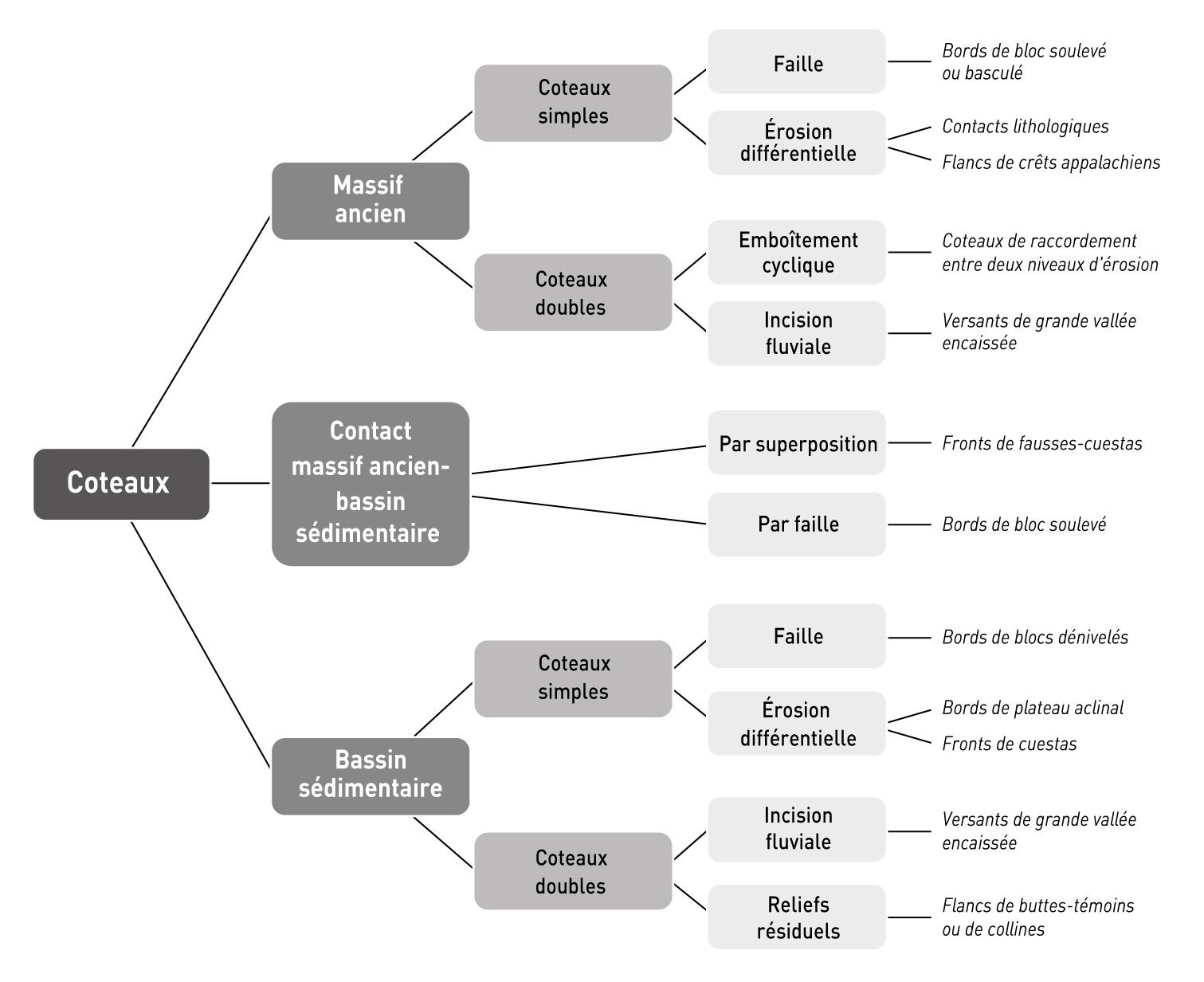Ils introduisent aux facteurs explicatifs des formes. Un versant, donc un coteau, provient ordinairement du recoupement d’une surface dans les régions de plates-formes, puisque tous les reliefs y dérivent de surfaces structurales ou de surfaces d’érosion. Ce recoupement peut tenir à trois causes. Une fracture (facteur tectonique) produit des escarpements de faille (dont le profil évolue sous les effets de l’érosion) ; ces escarpements sont simples ou multiples, et dans ce dernier cas, de même regard, donc successifs dans le paysage (si les failles sont synthétiques), ou de regards opposés, donc normalement symétriques (si les failles sont antithétiques). Une incision (par un cours d’eau), produit une vallée encaissée à versants doubles, de regards convergents (mais en l’occurrence espacés). Enfin un emboîtement de surfaces, significatif de la succession de plusieurs séquences d’aplanissement produit des formes étagées, assorties de versants singuliers qualifiés de versants cycliques.