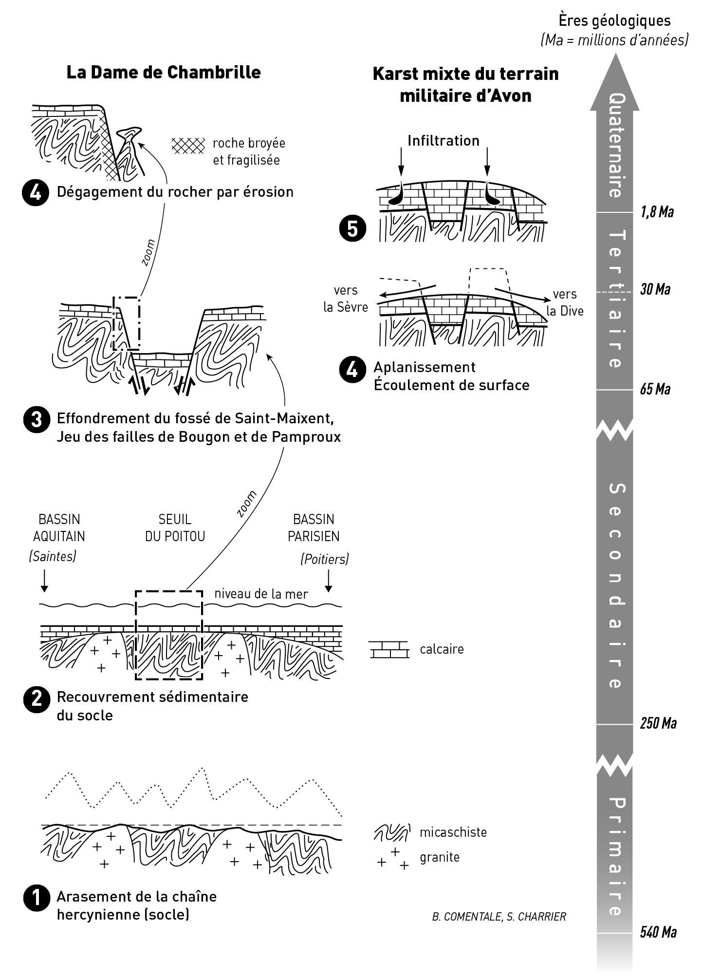 Figure 3 - Scénario de la genèse du relief dans la partie axiale du Seuil du Poitou