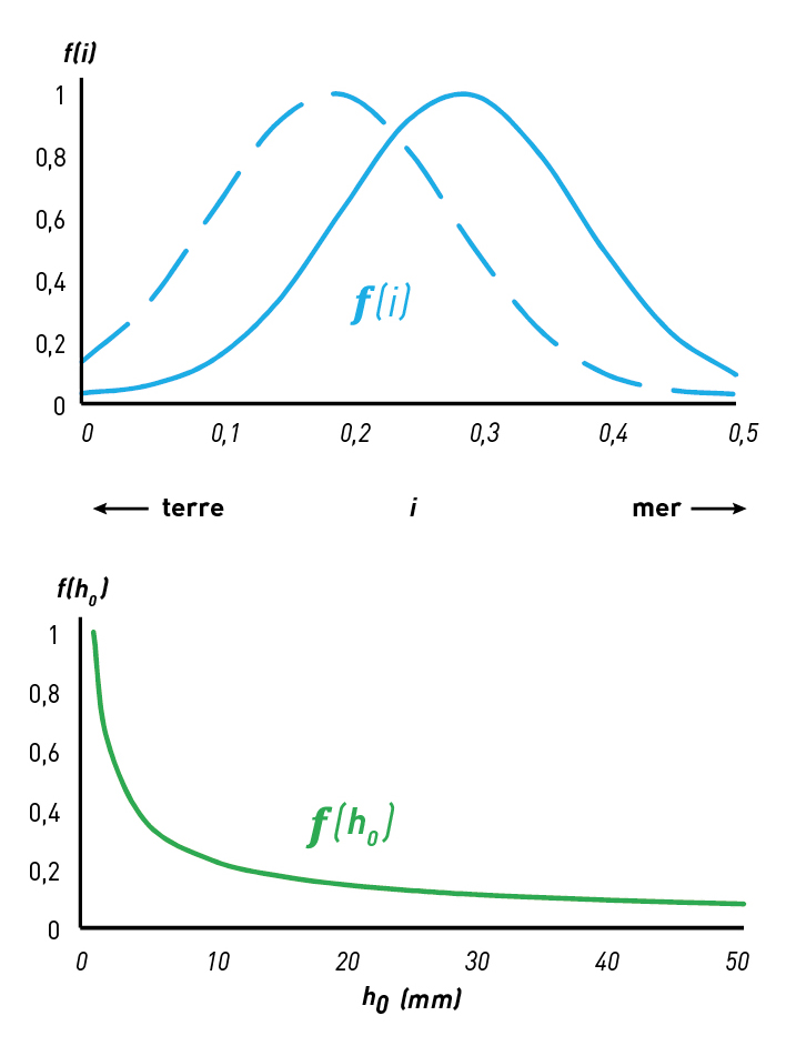La figure 5 illustre les courbes des équations (3) et (4). On voit que la fonction f(i) suit la courbe de Gauss modifiée avec sa valeur maximale f(i) = 1 dans la partie haute du littoral où i = m = 0,290 (29,0 %) pour les littoraux océaniques à marées et i = m = 0,191 (19,1 %) pour les mers intérieures car il n’y a presque pas de marées. Ainsi, les résultats d’observations montrent à l’évidence que dans cette partie du littoral le temps de contact du polluant avec l’air, l’eau de mer et le substrat ainsi que l’influence du ressac et du rayonnement solaire sont optimaux pour sa transformation. Ainsi, vers la mer et vers la terre f(i) diminue rapidement. En ce qui concerne la fonction f(h0), la courbe est hyperbolique : pour les pellicules du fioul fines (moins de 5 mm d’épaisseur) la vitesse de transformation naturelle est la plus importante et diminue rapidement dès lors que leur épaisseur augmente car l’accessibilité des hydrocarbures aux bactéries et aux facteurs environnementaux agissent de manière différenciée sur la surface du polluant. Par contre, pour les accumulations du fioul épaisses, leur surépaisseur n’influence pas beaucoup la vitesse du processus car la plupart du fioul de ces accumulations restent peu sensibles à la transformation naturelle.