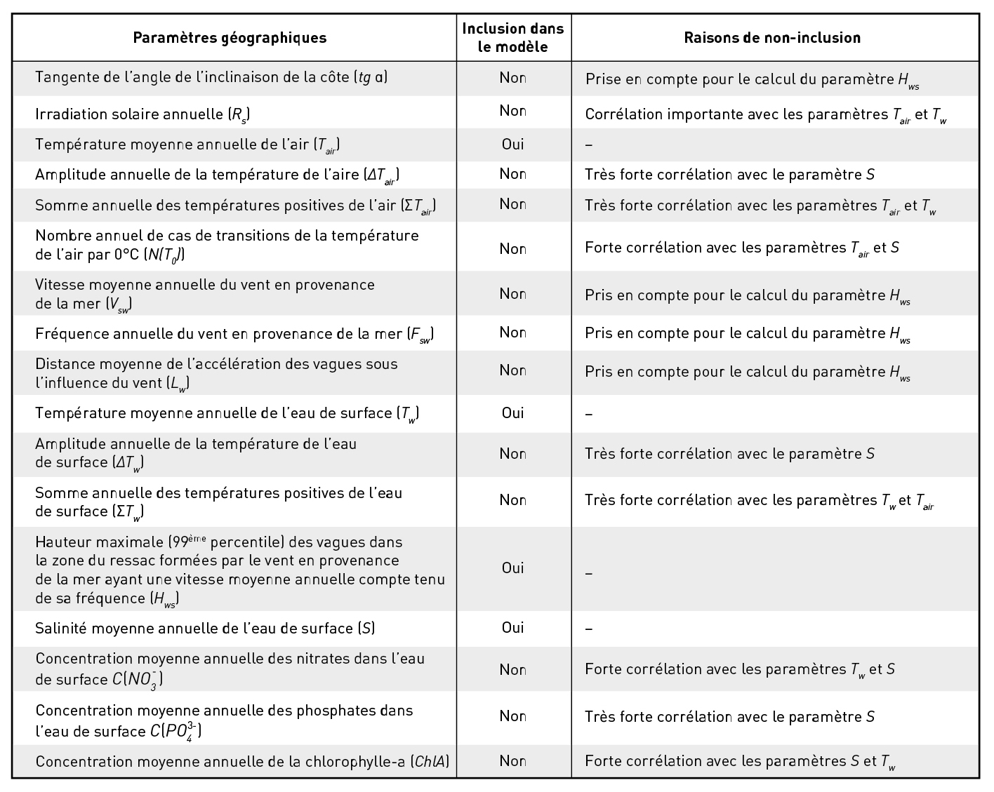 Au final, pour le modèle, trois paramètres relativement non-interdépendants ont été retenus. Ce sont : la température de l’environnement (T), la salinité de l’eau (S) et la hauteur des vagues dans la zone du ressac (Hws) intégrant d’autres paramètres géographiques qui sont interconnectés dans l’environnement. La température de l’environnement (T) est calculée à partir des températures moyennes de l’eau (Tw) et de l’air (Tair) en fonction de la probabilité de l'apparition du niveau de la mer au-dessus de la position de la trace d'hydrocarbures étudiée sur le profil de la zone littorale (i). Le tableau 2 explique l’inclusion ou non-inclusion des paramètres géographiques dans le modèle.