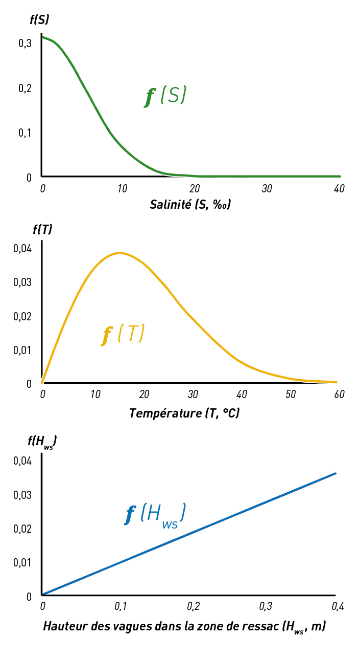 f(S), f(T) et f(Hws) sont respectivement les fonctions de la dépendance de k’ de la température de l’environnement (T, °C), la salinité de l’eau de surface (S, ‰) et la hauteur maximale (99ème percentile) des vagues dans la zone de ressac formées par le vent en provenance de la mer ayant une vitesse moyenne annuelle compte tenu de sa fréquence (Hws, m) ; le terme constant c = –0,0385.