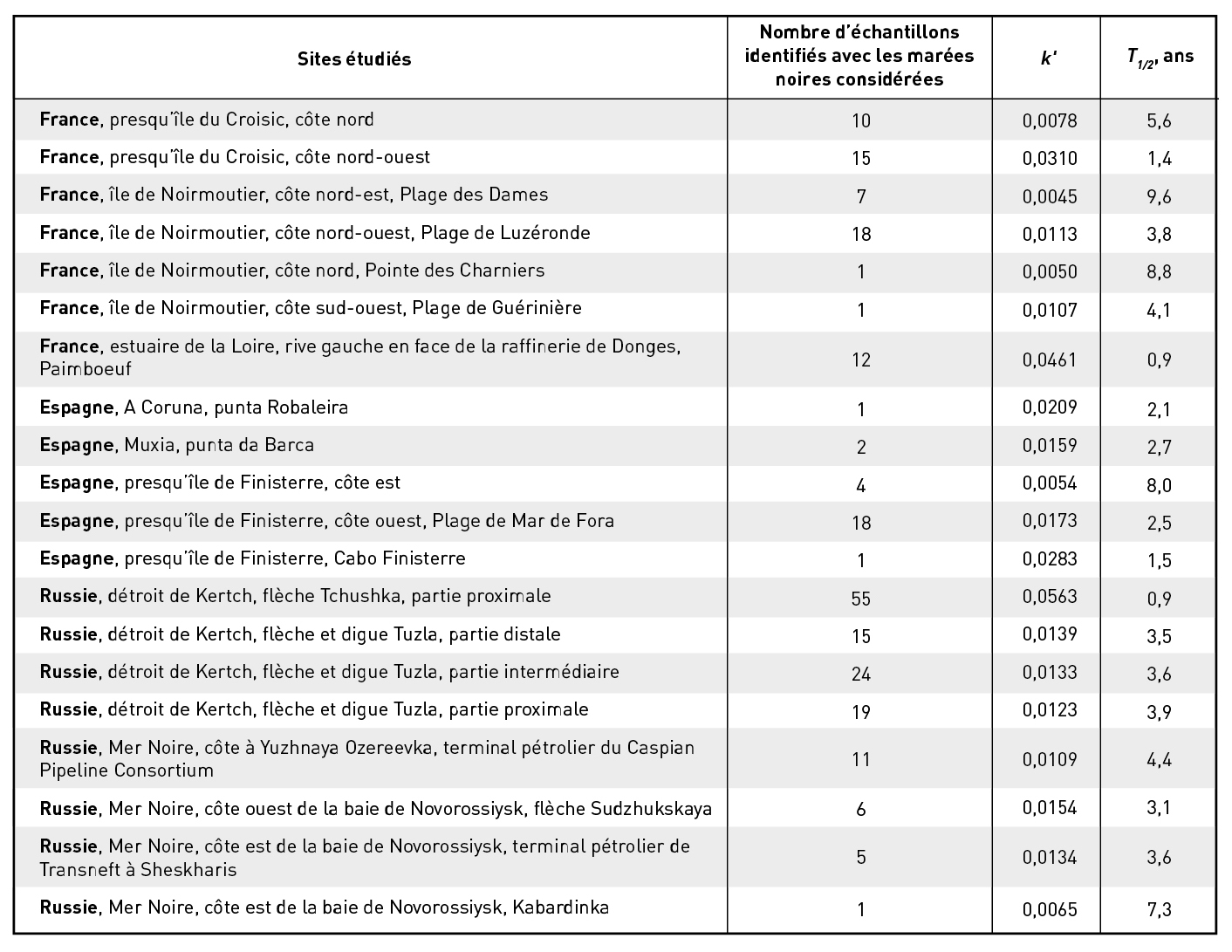 Tableau 3 Les valeurs de la constante de la vitesse de transformation naturelle du fioul k’ et de la demi-période de la diminution de son volume (T1/2) pour les parties hautes des littoraux étudiés