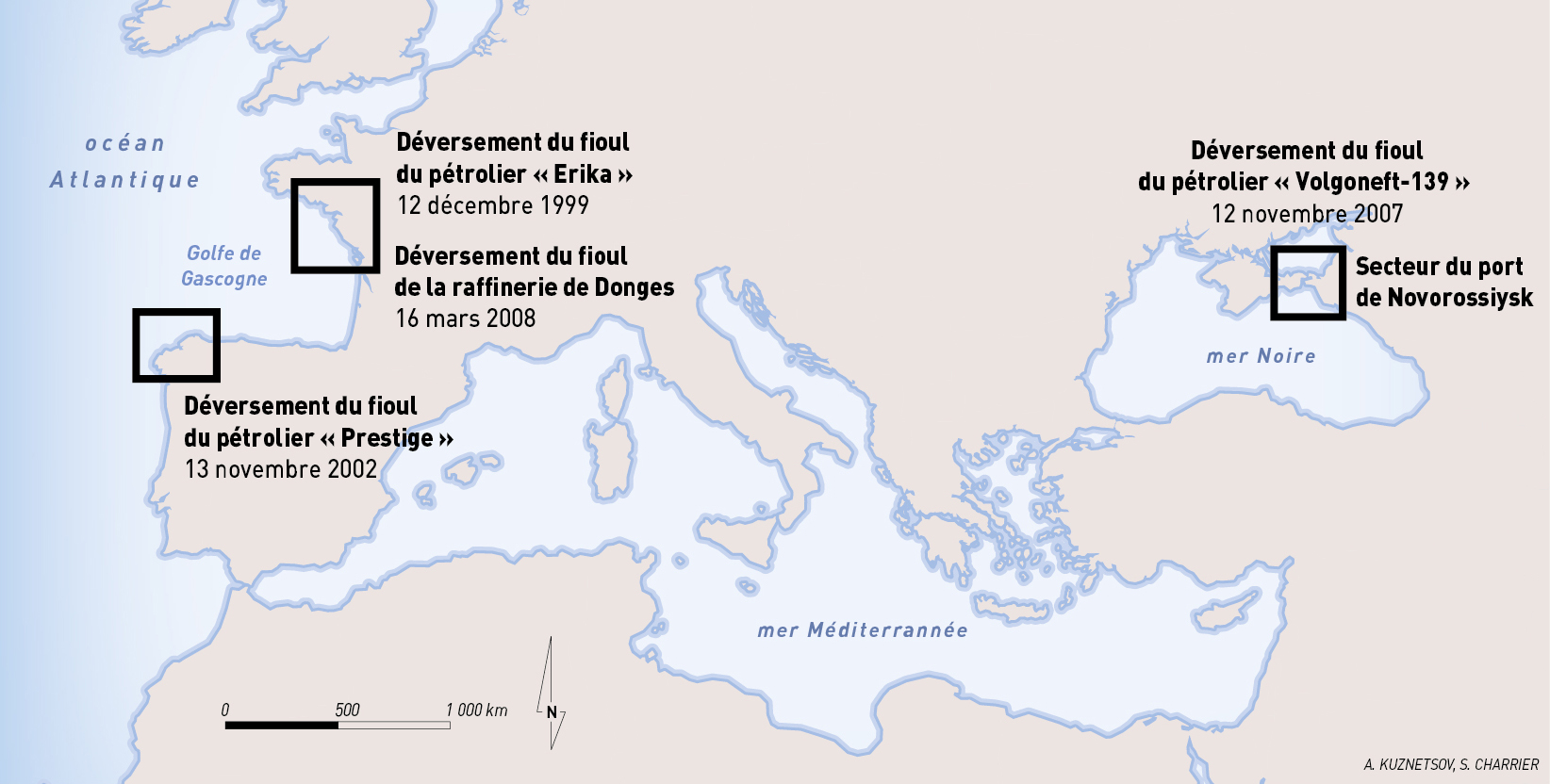 Cet article s’appuie sur le résultat de recherches menées pendant 17 ans sur les côtes françaises, espagnoles et russes touchées par des marées noires. Il s’inscrit dans le cadre d’une coopération et ce depuis les années 1990, entre les géographes de l’Université Fédérale du Sud de la Russie et de Nantes Université en France impulsée par le professeur Claude Cabanne lors d’une de ses nombreuses missions en Russie. Les auteurs de cet article lui sont très reconnaissants pour son soutien important, les discussions toujours intéressantes ainsi que pour ses nombreux conseils sages et visionnaires. Il demeure de ce temps, un très bon souvenir de Claude Cabanne, collègue et ami, qui restera pour toujours dans nos cœurs et notre mémoire !