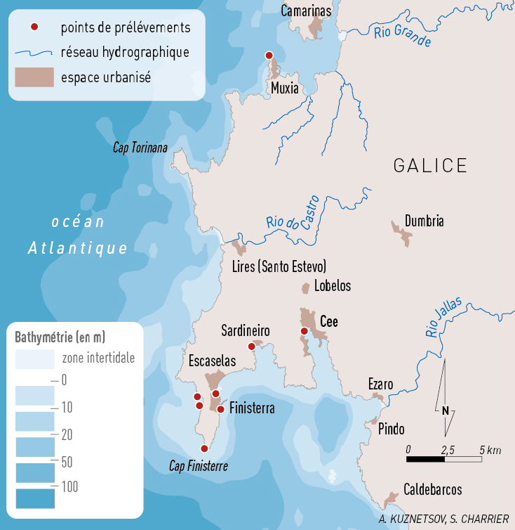 En Espagne, en novembre 2002, le pétrolier Prestige se brise en deux et coule au large du Cap Finisterre déversant progressivement 64 000 tonnes de fioul lourd (mazout M-100) qui touchera la côte galicienne, ainsi qu'une grande partie du sud du golfe de Gascogne polluant en tout près de 1 000 km de côtes constituées principalement de hautes falaises et de petites plages de sable au sein des baies (Rousseau, Girin, 2004 ; Fattal, 2004). En Galice, les observations et les prélèvements ont été effectués entre 2012 et 2017, principalement dans le secteur de la presqu’île de Finisterre, épicentre de la marée noire du Prestige (fig. 2b).