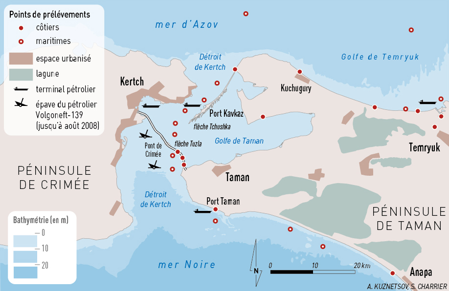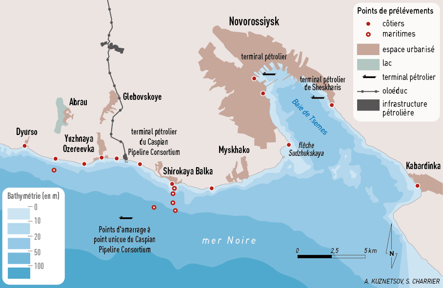 En Russie, en novembre 2007, dans le détroit de Kertch, une tempête violente a eu pour conséquence de briser en deux le pétrolier Volgoneft-139 déversant dans le milieu environ 1 300 tonnes de fioul lourd (mazout M-100). Près de 50 kilomètres de côtes à falaises argileuses, de plages, flèches de sable principalement organogènes, ont été touchées ainsi que la baie de Taman peu profonde et vaseuse (Klenkin, Agapov, 2011 ; Kuznetsov, Fedorov, Fattal, 2013). Rappelons que le détroit de Kertch est le lieu de passage maritime pour l'exportation du pétrole russe qui transite de la Volga vers le Don et la mer Noire. En mer Noire, un quart de toute l’exportation du pétrole et du fioul russe ainsi que presque toute l’exportation du pétrole kazakh (plus de 100 millions de tonnes par an) transite par le port de Novorossiysk qui se trouve à 110 km au sud-est du détroit de Kertch au sein de la baie de Tsemes au pied des contreforts du Caucase. Dans ce secteur, les observations aériennes et satellites détectent souvent des nappes d’hydrocarbures autour de Novorossiysk et le long des routes maritimes (Bedritskii et al., 2007) mais on trouve aussi régulièrement des traces fraîches ou altérées du fioul du Volgoneft-139 ou d’autres sources inconnues, notamment sur les platiers et hautes falaises rocheuses de flysch, sur les plages de graviers et de galets ainsi que dans les baies (Kuznetsov, Fedorov, 2020). Dans le détroit de Kertch et le secteur de Novorossiysk, les observations et les prélèvements ont été effectués entre 2007 et 2021 sur la flèche Tchushka à l’entrée de la mer d’Azov et sur la flèche et la digue Tuzla à l’entrée de la mer Noire là où l’essentiel du fioul déversé en 2007 s’était échoué (fig. 2c), ainsi que sur la côte de la mer Noire à proximité des terminaux pétroliers de Yuzhnaya Ozereevka et de Sheskharis (fig. 2d).