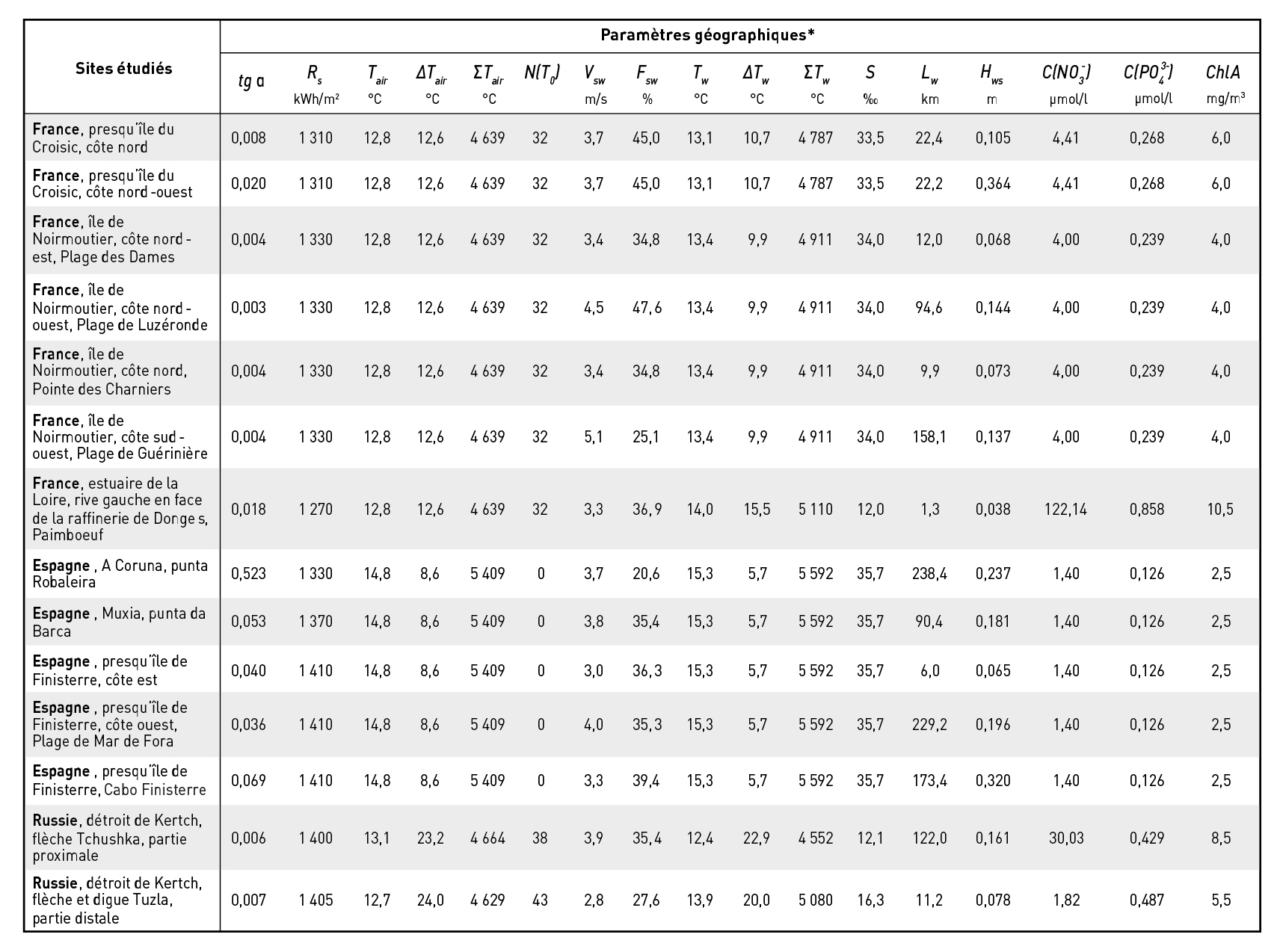 Le climat de la façade atlantique étudiée en France est de type océanique tempéré, avec une température moyenne annuelle de l’air et de l’eau de surface qui est de l’ordre de 13 °C avec une amplitude annuelle comprise entre 9 et 13 °C (tab. 1). Les vent dominants (47 % de la fréquence) sont du secteur ouest avec une vitesse moyenne annuelle de 3,7 à 5,1 m/s. Sur ces littoraux, les pentes moyennes (tous types de côtes confondues) sont relativement faibles (entre 0,3 et 2,0 cm/m). Les vagues dans la zone de ressac, pour les vents en provenance de la mer (vitesse moyenne annuelle) atteignent une hauteur maximale comprise entre 7 cm dans des secteurs abrités, et 37 cm dans des secteurs exposés (99ème percentile). Sur la façade atlantique, la salinité de l’eau est de 34 ‰, (voir source tab. 1) alors que celle-ci diminue au fur et à mesure que l’on pénètre dans l’estuaire. Les concentrations des nutriments et de la chlorophylle-a (indicateur de la bioproductivité) dans ces eaux océaniques sont relativement élevées voire très élevées dans l’estuaire de la Loire dépassant les concentrations du sud de la mer d’Azov et du détroit de Kertch.