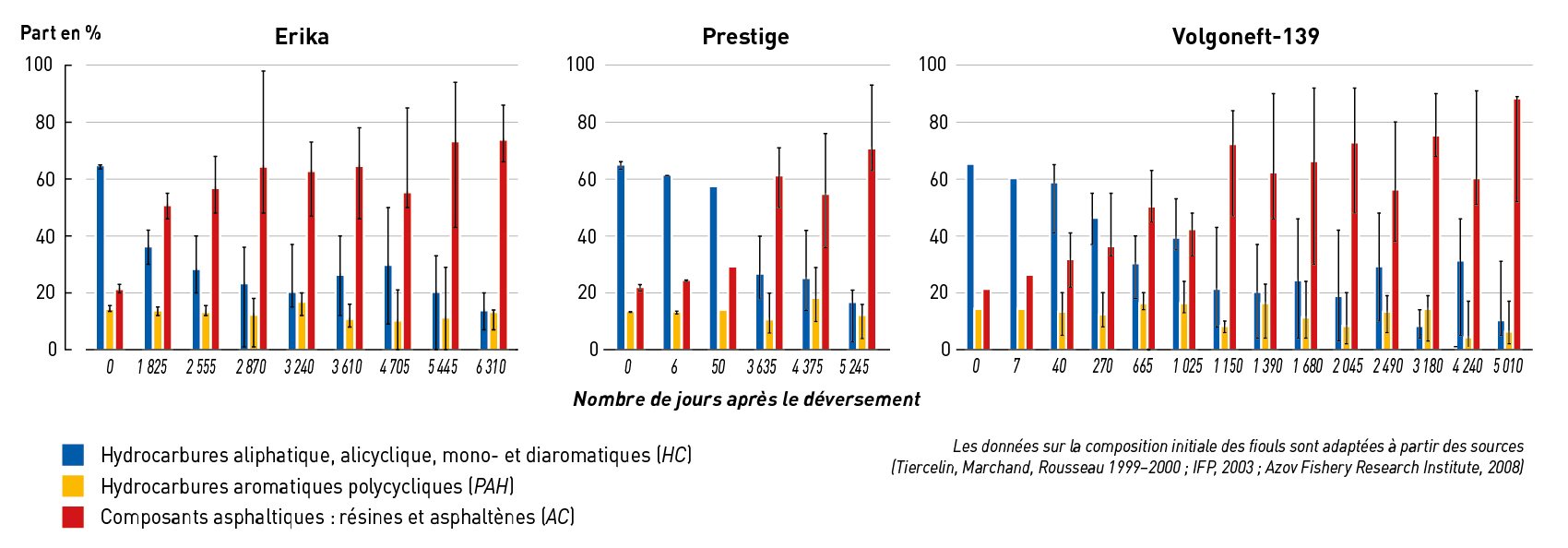 Les résultats d'observations sur une longue durée montrent que sur les côtes la quantité et la taille des traces de fioul adhérentes aux rochers ou aux infrastructures diminuent avec le temps en raison de leur dégradation naturelle. Néanmoins, même altérées, ces traces sont toujours présentes, 17 ans après la marée noire de l’Erika et 14 ans après l’accident du Prestige et du Volgoneft-139.
