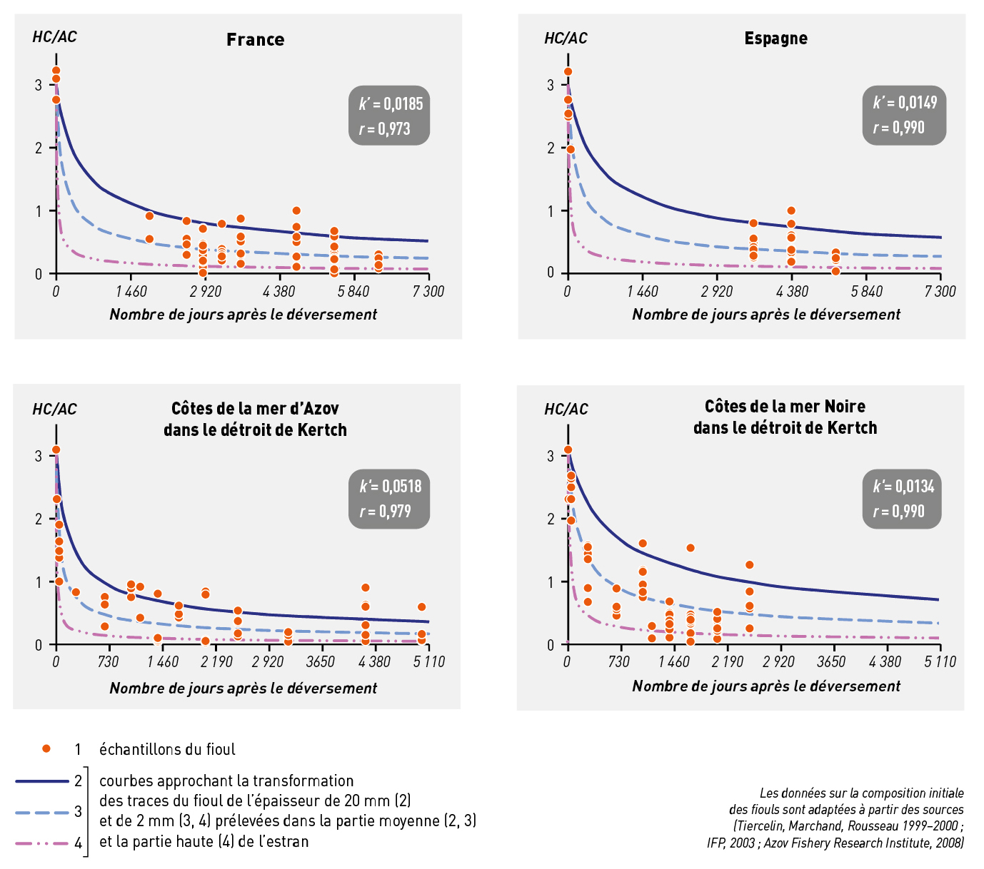 Les changements temporels de la composition des traces d’hydrocarbures observés sur les côtes (fig. 3) montrent une diminution stable du pourcentage d’hydrocarbures aliphatique, alicyclique, mono- et di-aromatiques (HC) qui ont un poids moléculaire relativement faible et sont plus sensibles aux processus d'évaporation, de dissolution et de biodégradation, tandis que les composés résineux et asphaltiques (AC) sont plus lourds et plus persistants, induisant un pourcentage résiduel qui augmente. Par ailleurs, le pourcentage d’hydrocarbures aromatiques polycycliques (PAH) ne révèle pas de changements temporels significatifs même si la masse de ces derniers diminue aussi avec le temps. C’est la raison pour laquelle (Fedorov, Stradomskaya, Kuznetsov, 2006) il a été suggéré que la proportion entre les composants pétroliers labiles et persistants (HC/AC) puisse être considérée comme un indicateur simplifié du niveau de transformation des traces du polluant et par conséquent, il est proposé que la vitesse de diminution de cette proportion puisse être utilisée pour quantifier la dynamique de la dépollution naturelle du milieu. De plus, la proportion HC/AC est plus appropriée que la concentration de masse car elle ne prend en compte que le changement de la composition chimique et n'est pas considérablement influencée par la dilution, la migration ou d'autres processus mécaniques qui n’ont rien à voir avec la destruction du polluant.
