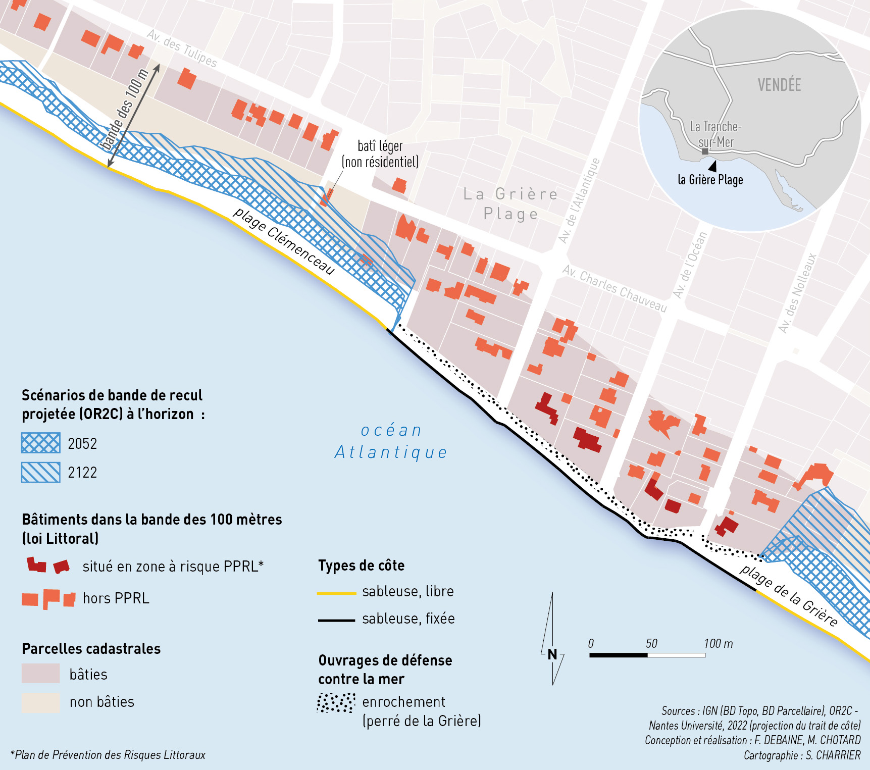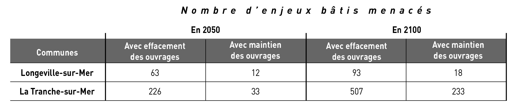 Au-delà des aléas physiques, le bassin du Lay présente des vulnérabilités socio-économiques remarquables. L'évolution historique de l'urbanisation montre que la densification dans les zones exposées a accru la vulnérabilité du territoire (fig. 2). Le diagnostic a également consisté à croiser les unités foncières et les bâtiments1 avec la bande littorale des 100 m, le Plan de Prévention des Risques Littoraux (PPRL) et les traits de côte projetés (2052 et 2122). Les résultats révèlent que, même en tenant compte des ouvrages de défense et mesure de protection, plusieurs bâtiments et espaces naturels seraient directement menacés à l'horizon 100 ans. Ces chiffres seraient supérieurs si les projections incluaient la défaillance des ouvrages (fig. 6).