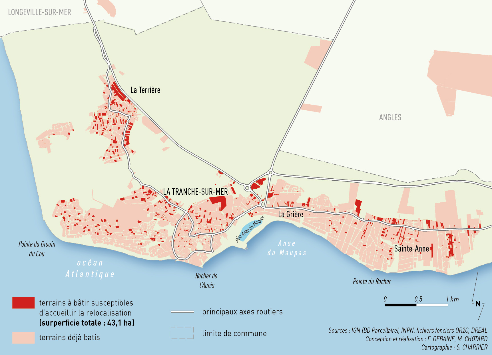 Conformément aux orientations de la loi Climat et Résilience, seuls les terrains localisés en zones urbaines (U) ou à urbaniser (AU) des documents d'urbanisme ont été retenus. Ce premier filtrage a ensuite été affiné à partir de critères complémentaires portant sur la surface des parcelles, leur usage actuel, la topographie (exclusion des zones basses), ainsi que sur leur environnement urbain, avec une priorité donnée aux secteurs déjà urbanisés afin de favoriser la densification et de limiter l'étalement urbain. À l'issue de cette analyse, environ 326 hectares de terrains apparaissent compatibles avec ce scénario de relocalisation, constituant un gisement potentiel permettant d'envisager des stratégies de négociation fondées sur la compensation, totale ou partielle, des pertes d'aménités liées à l'éloignement du littoral, dont 43,1 ha à La Tranche-sur-Mer (fig. 7).