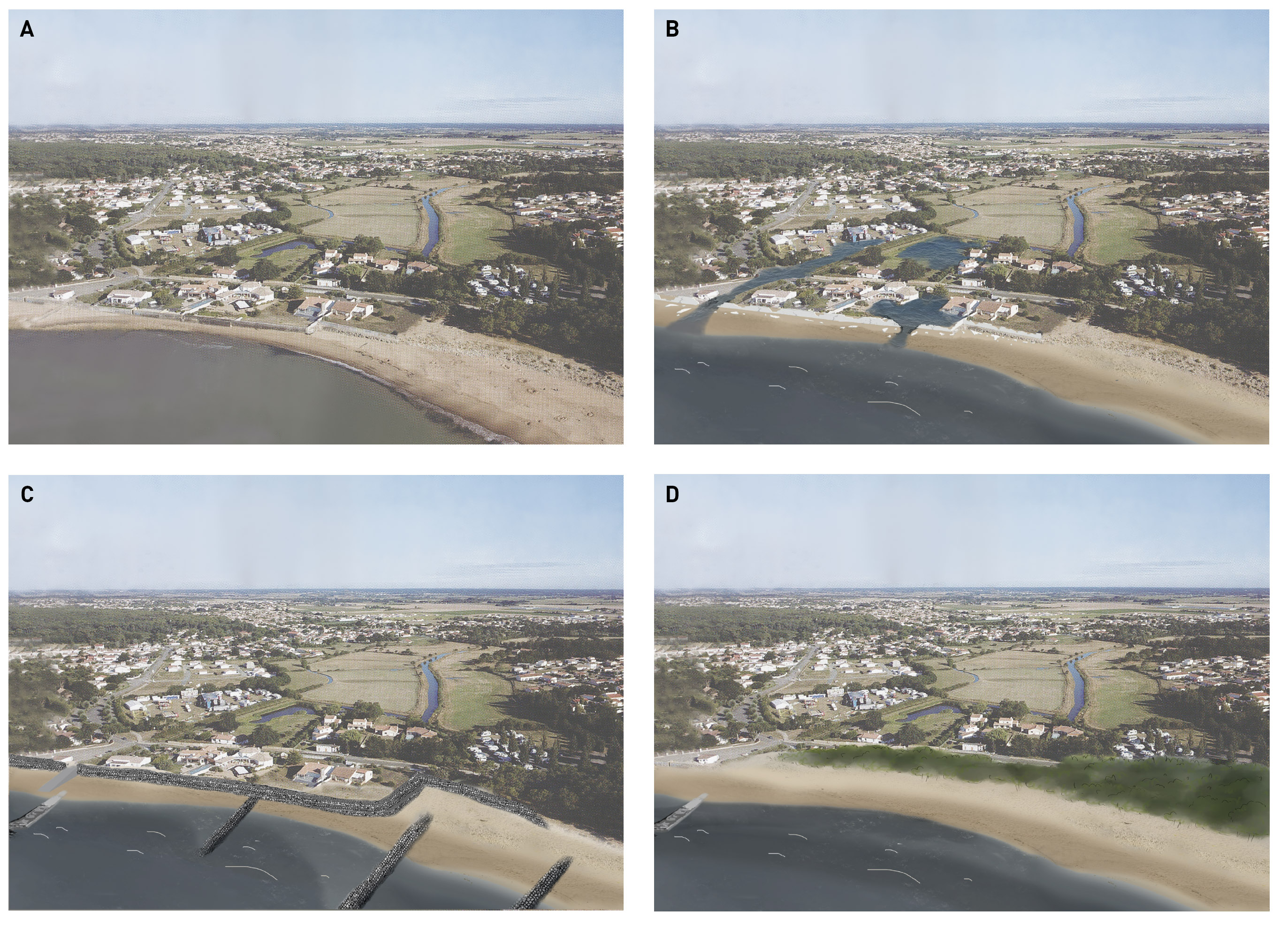 Figure 8 - Prospective paysagère sur le secteur du Goulet destinée à évaluer l'acceptabilité de plusieurs scénarios d'adaptation (A : état actuel du site ; B : scénario du laisser faire ; C : scénario de lutte active ; D : scénario de relocalisation et renaturation du site)