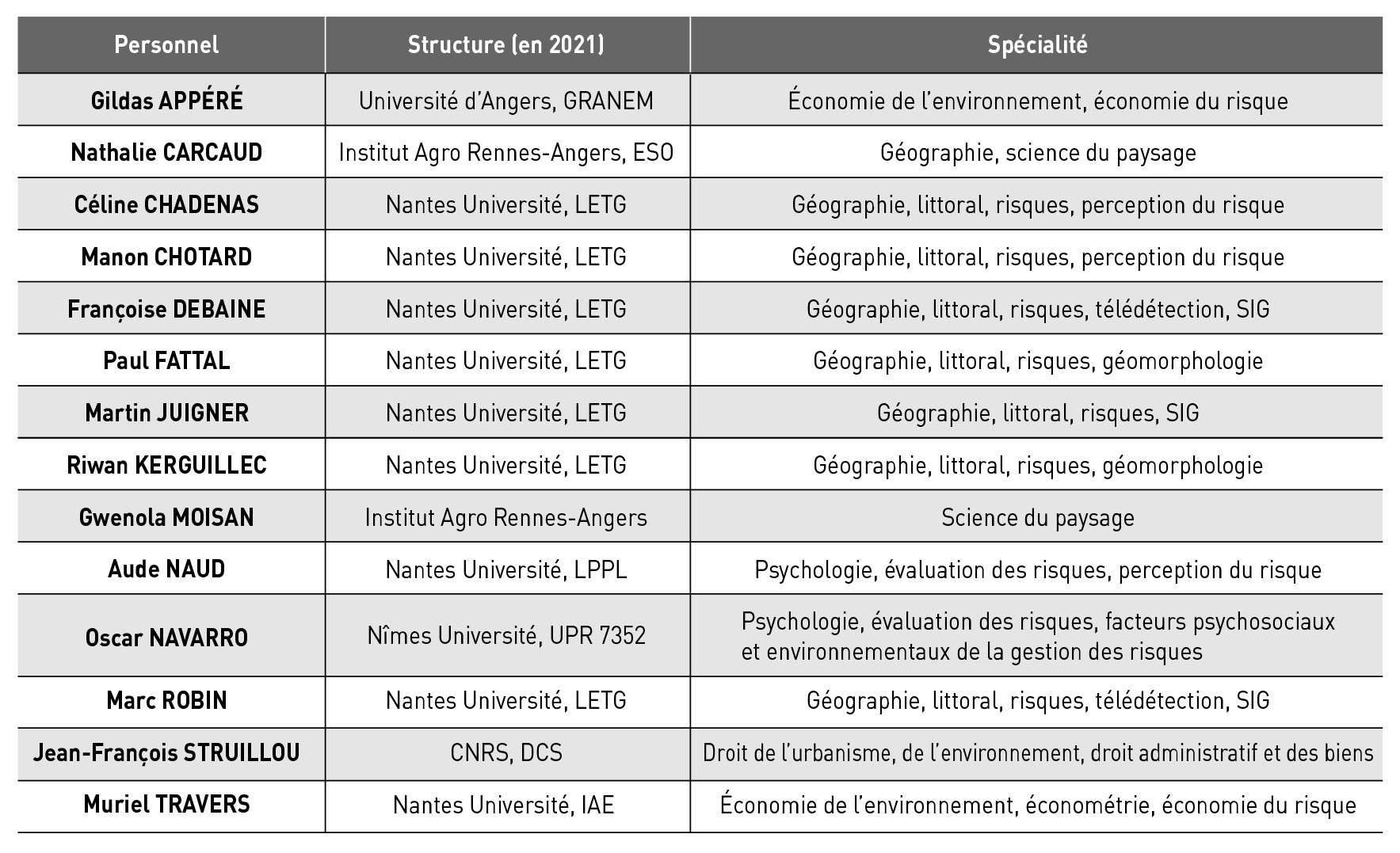 La démarche d'accompagnement exposée dans cet article a été portée par une équipe pluridisciplinaire regroupant des spécialistes issus de disciplines diverses et de plusieurs universités ou laboratoires de recherche (tab. 1). Elle a été conduite dans le cadre des travaux de l'Observatoire Régional des Risques Côtiers en Pays de la Loire (OR2C).