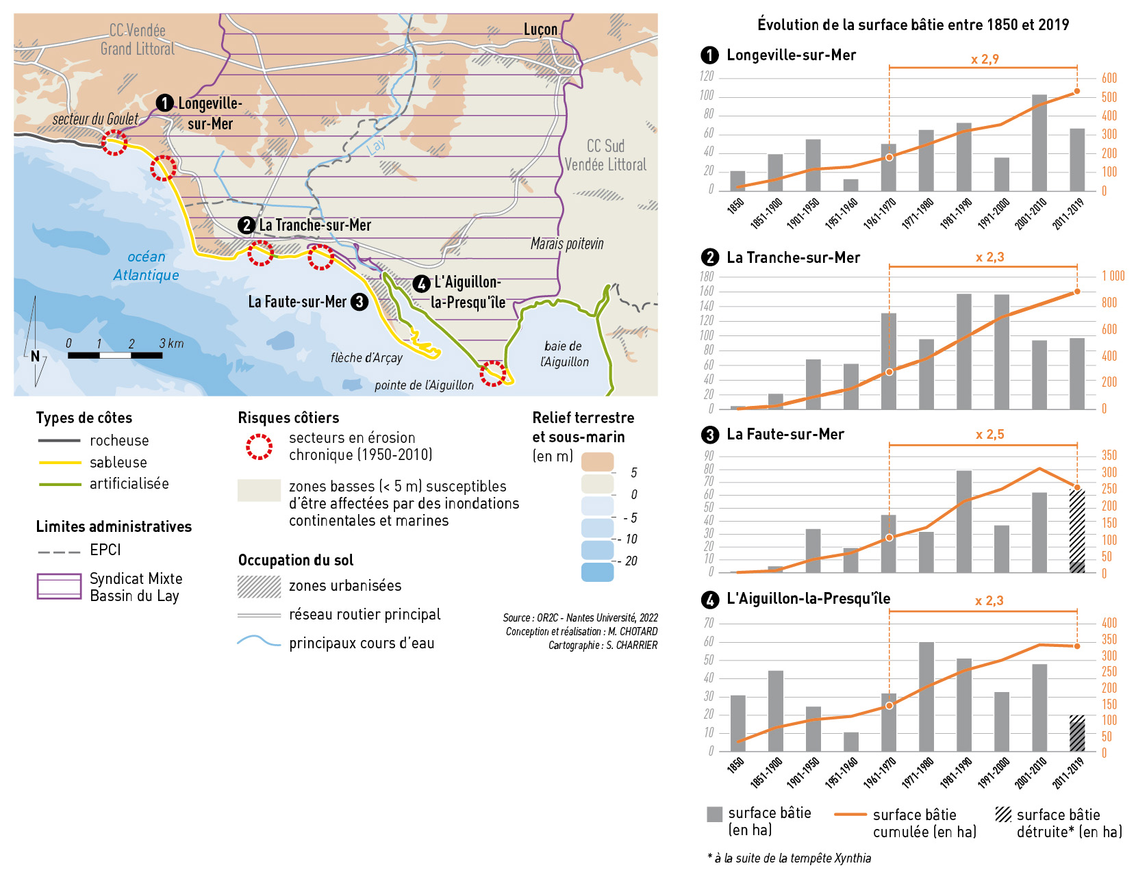 Figure 2 - Localisation et diagrammes d’évolution de la surface bâtie sur les communes de Longeville-sur-Mer, La Tranche-sur-Mer, La Faute-sur-Mer et L’Aiguillon-la-Presqu’île