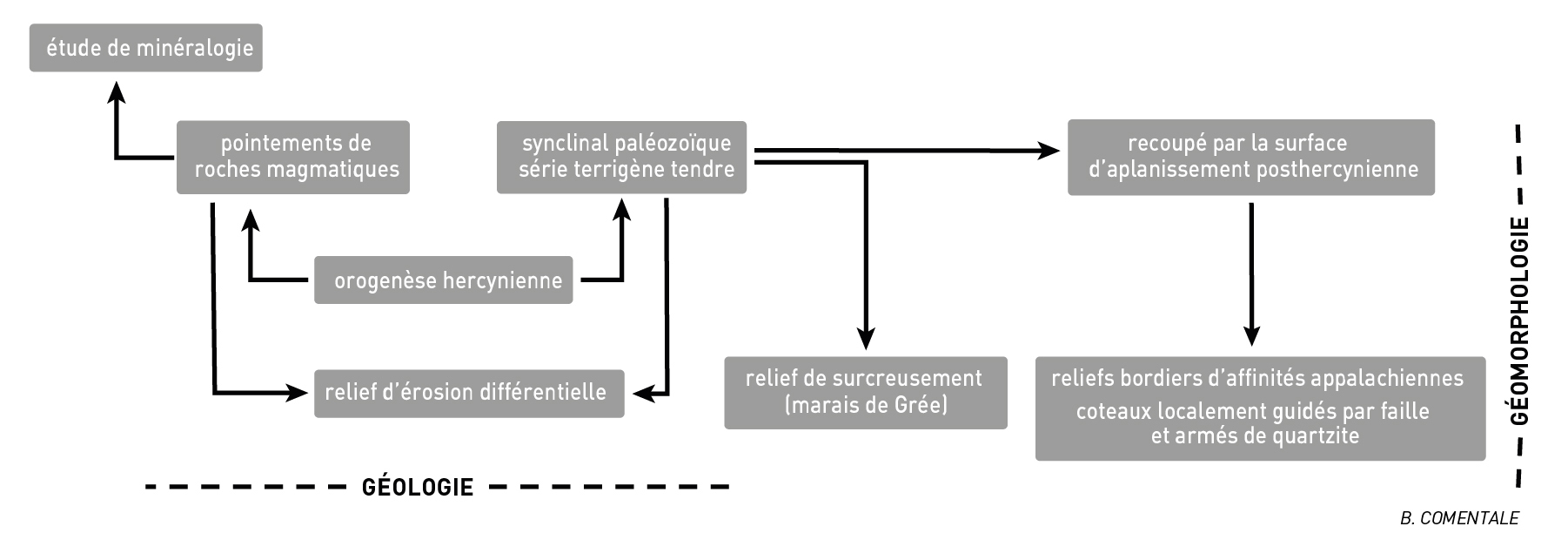 Dans le prolongement du présent article, qui rappelle la vocation productive et minière du département de la Loire-Atlantique – même si l’épilogue en tempère le constat quant au bassin d’Ancenis –, nous proposons une esquisse géomorphologique des lieux, moins souvent étudiés que les plateaux des abords de Nantes ou le relief appalachien des environs de Chateaubriant. La forme elliptique du bassin, encadré de coteaux de roches résistantes, est calquée sur la structure synclinale initiale. En partie ouvert sur la Loire, le bassin d’Ancenis est tributaire des étapes du façonnement du Massif armoricain même s’il en représente un type original. Le bassin d'Ancenis représente l'un des secteurs les plus déprimés du département de la Loire-Atlantique, proche du niveau de la Loire. Il dérive d’un synclinal d’âge paléozoïque ultérieurement tronqué par la surface d’aplanissement post-hercynienne, ce qui, de ce fait, autorise à qualifier au moins pro parte un relief appalachien. Ainsi, en première approximation, les coteaux qui le limitent au nord et au sud, et qui dessinent un relief en amande, s’apparentent à des crêts appalachiens armés par une série schisto-gréseuse dévonienne, représentée notamment par les quartzites de la Pierre Meslière, et ultérieurement fracturée. Ils constituent un relief d’érosion différentielle, en contraste lithologique avec l’épaisse série détritique terrigène (Sellier, 1985, p. 19), rapportée à la charnière Dévonien/Carbonifère (Frasno-Dinantien), qui arme la partie centrale du bassin, formant un plancher topographique le plus souvent situé à 25-30 mètres d’altitude (fig. 2). Dans le bassin, des éminences localisées correspondent aux intrusions magmatiques carbonifères, objets de l’étude minéralogique qui précède, notamment près de Mésanger : la Quéteraie (64 m), la Ferlauderie (41 m), ou encore Pied Bercy (38 m) plus à l’est. Ces points hauts relatifs sont souvent pourvus de moulins à vent, aujourd’hui en ruine. A l’opposé, le fond du bassin est surcreusé en cuvettes de faible altitude, telle la cuvette des marais de Grée à 6 m d’altitude, raccordée au niveau de la Loire (Kerguillec, 2016). Le bassin d’Ancenis reproduit les contours du synclinal originel. Au sud-ouest, il est limité par les hauteurs du Coteau de Couffé, armé par la formation quarztitique précitée et recoupé à l’emporte-pièce par la vallée de la Loire. Le sommet plan du Coteau de Couffé atteint près de 70 mètres d’altitude. Son tracé de détail présente un décalage majeur à Couffé, le long d’un décrochement dextre d’orientation N 160° (Sellier, 1985, pp. 245-247). Au nord, le bassin d’Ancenis est encadré par le Coteau de Pouillé (Sellier, 2020), qui correspond à un horst et est en partie armé par la même formation de quartzite, déterminant des altitudes de 70 à 80 mètres le plus souvent. La mise en évidence de la minéralogie et de la pétrographie des intrusions magmatiques du bassin d’Ancenis s’articule avec cette brève esquisse géomorphologique par le biais de l’examen de la structure (fig. 3) : pointements de roches magmatiques et synclinal paléozoïque sont deux manifestations locales de l’orogenèse hercynienne ; la surface d’aplanissement post-hercynienne, attribut habituel d’un massif ancien tel le Massif armoricain, détermine les crêtes bordières à sommet plan, d’affinités appalachiennes ; le défoncement de cette dernière, dans les séries tendres de l’axe du synclinal, a permis d’une part la mise en valeur du contraste lithologique qu’elles présentent avec les intrusions magmatiques, d’autre part les surcreusements locaux. Au sud immédiat du Castelbriantais et de son relief appalachien stricto sensu, et à l’amont des plateaux du « pays » nantais et de l’estuaire de la Loire (Sellier, 2013), le bassin d’Ancenis représente un type original du relief sud-armoricain. Bibliographie Kerguillec R., 2016. Du déclin d’une zone humide à sa reconnaissance patrimoniale : l’évolution récente du marais de Grée (Loire-Atlantique), Les Cahiers Nantais, 2016-1, pp. 17-29. Sellier D., 1985. Les versants du Pays nantais, étude géomorphologique, Thèse de Doctorat de 3e cycle, université de Nantes, 506 p. Sellier D., 2013. Le relief de la Loire-Atlantique : patrimoine géomorphologique et géomorphosites, in : Morice J.-R., Saupin G., Vivier N. (dir.), Les nouveaux patrimoines des Pays de la Loire, Presses Universitaires de Rennes, pp. 236-255. Sellier D., 2020. Essai sur la notion de coteau en Pays de la Loire, Les Cahiers Nantais, 2020, pp. 127-147. |