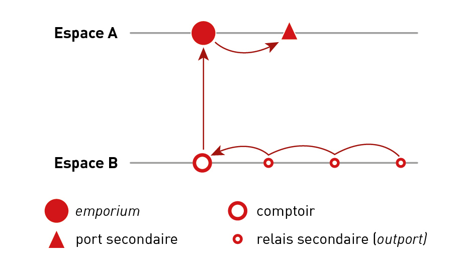 Note de lecture : Dans une économie préindustrielle, l’intégration des arrière-pays est très faible. Le commerce est dominé par quelques villes marchandes (espace A) dont les bourgeoisies négociantes ou les compagnies à monopole contrôlent les réseaux maritimes, selon un schéma presque stolonifère (un comptoir dans l’espace B regroupant les marchandises des relais secondaires (outports), la ville marchande de l’espace A se chargeant des réexpéditions vers les ports secondaires, moyennant des profits liés à une économie de la rareté.