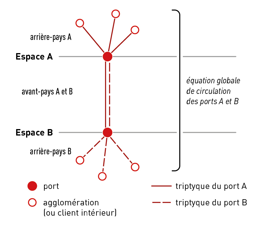 Chaque port peut donc être analysé à l'intersection d'un avant-pays (foreland) et d'un arrière-pays (hinterland), ce dernier étant à bien distinguer de l'aire polarisée par la ville portuaire (umland), puisque l'hinterland est affaire de relations contractuelles entre des acteurs économiques, alors que l'umland est la marque d'une polarisation démographique fondée sur des prestations de services. Chaque port baigne donc dans un espace de circulation qu'on peut schématiser par le sigle T3 (T pour triptyque et 3 pour ses trois éléments). La première formulation de l'équation de la circulation mise en avant par A. Vigarié était directement inspirée par les trois composantes fondamentales du triptyque (1964, p. 14 ; 1968, p. 38) et se présentait comme suit dans sa dernière itération où « Cg est le coût global, FA le montant des frets et assurances maritimes, Fp le total des frais de port et Tt le prix des trajets sur transport terrestre » (1972a, p. 643) :