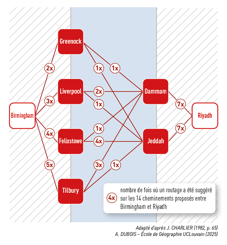 Dans la pratique, on dispose de peu d'études relatives à l'architecture concrète de tels acheminements de porte à porte, vu la confidentialité des données commerciales dans le monde ultra concurrentiel du transport maritime, où la tarification standardisée des conférences maritimes n'est plus qu'un lointain souvenir. Avant que les opérateurs ne deviennent totalement rétifs à répondre ouvertement à une telle demande, une enquête a été menée en août 1977 par le mensuel spécialisé britannique Containerisation International via une demande de cotation fictive pour l'acheminement d'un conteneur FCL (Full Container Load) de 20 pieds, chargé de 18 tonnes de livres de Birmingham à Riyadh (Gibney, 1977). Les quatorze cheminements proposés impliquaient tous le chargement du conteneur dans un port britannique avec acheminement maritime direct sur un port saoudien. Quatre ports insulaires entraient en ligne de compte : Liverpool (à 160 km de Birmingham), Tilbury (à 250 km), Felixstowe (à 280 km) et même Greenock en Écosse (à 490 km). À l'autre bout de la chaîne, les deux grands ports saoudiens de l'époque étaient proposés : Jeddah en mer Rouge et Damman dans le golfe Arabo-Persique, avec une différence de temps de navigation largement favorable au premier (le canal de Suez venant de rouvrir). Au total, huit combinaisons portuaires avec acheminement maritime direct étaient proposées (fig. 4).