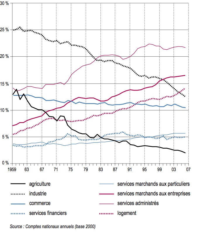 Figure 1 : évolution de la part des principales branches d’activité dans la valeur ajoutée, France, 1959-2006.