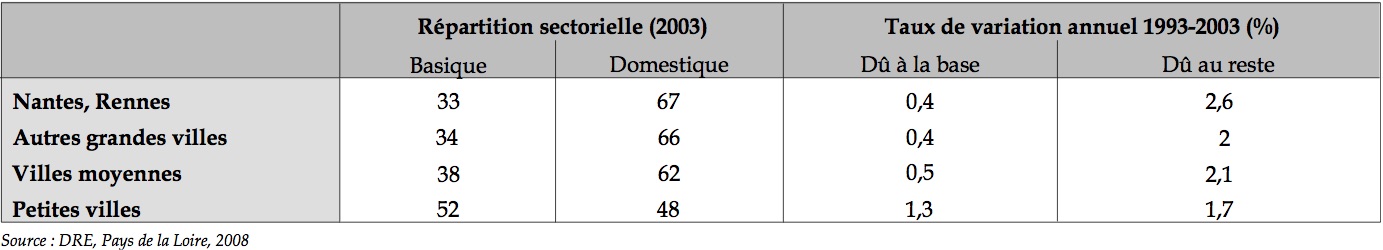 Bref, si les activités « exportatrices » ont vu dans l’ensemble leur valeur ajoutée progresser en valeur absolue, quoiqu’à un rythme très ralenti depuis 30 ans, leur importance relative dans le système productif s’est nettement amoindrie, notamment en termes d’emploi. C’est en particulier le cas dans les territoires économiquement les plus développés, c'est-à-dire les échelons supérieurs du système de peuplement, et notamment dans le Grand Ouest, entendu au sens des régions Bretagne et Pays-de-la-Loire. Une récente étude sur leur armature urbaine (DRE Pays-de-la-Loire, 2008), dont les résultats sont retranscrits dans le tableau 1, le montre nettement.