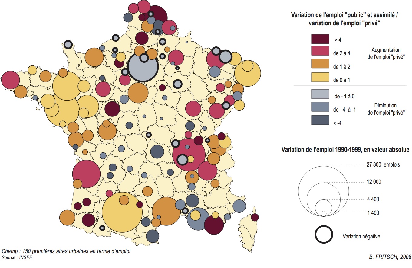 Schématiquement, à l’exception de Strasbourg, Toulouse et d’une partie du Grand Ouest, les créations d’emploi public et assimilé ont été plus de deux fois supérieures à celles des emplois privés. Dans nombre de cas elles ont compensé une érosion de l’emploi privé, en villes moyennes le plus souvent, mais aussi dans de grandes agglomérations (Marseille, Nice, Clermont-Ferrand). Mais elles n’ont pas suffi dans le cas de Paris, métropole incontestée en théorie bénéficiaire de la mondialisation et principal pôle d’innovation du pays.
